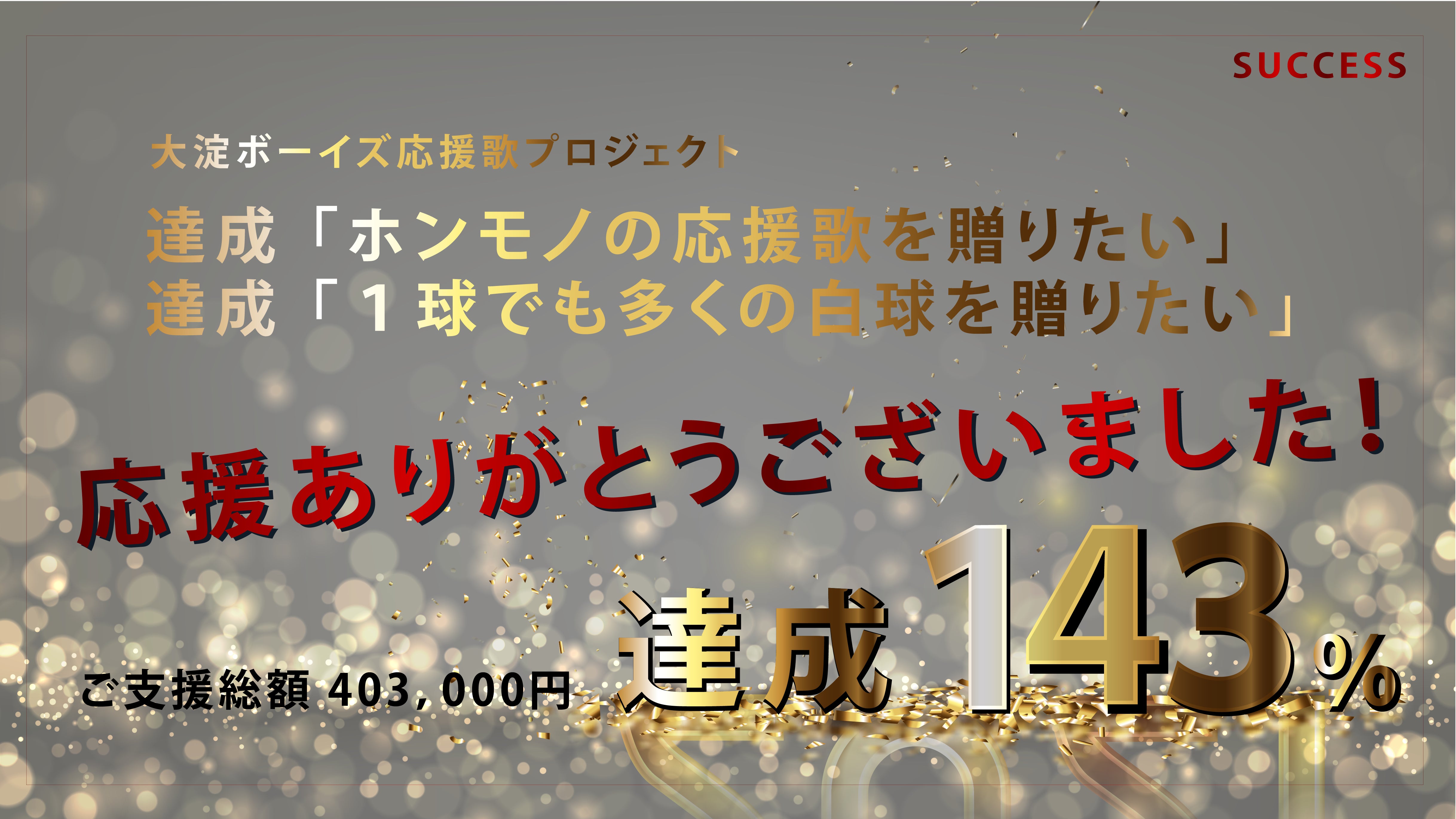 2021/06/01 07:36ご支援、応援くださった皆様へ昨夜23:59、クラウドファンディングを終えました。ご支援・応援くださった方々、プロジェクトの存在を広めてくださった方々、本当にありがとうございました。結果を報告します。<大淀ボーイズ応援歌プロジェクト> 当初目標: 280,000円 達成金額: 403,000円 達 成 率: 143% 支援者数: 48名【使いみち】(当初計画から変更なし) ・応援歌MV制作の必要経費 ¥210,000 ・野球用具(硬式球等)の購入費用 ¥117,639 ・システム利用料・税等 ¥75,361楽曲、MVの完成品や、新品のボールを手にした選手達の様子などは、今後も報告してまいります。今回のプロジェクトは、コロナ禍という大変な時期に、明るいニュースをお届けできるようにという想いが根本にあります。最後にプロジェクトを完成させるのは、大淀ボーイズ中学部の選手達。ぜひとも全国大会でもう一度優勝し、物語をハッピーエンドで締めくくってほしいと思います。いま、世の中は暗い話題ばかり。誰もがしんどくなっている時期にもかかわらず、こうして温かくアツいご支援、ご声援をいただけたこと、本当にうれしく、胸がいっぱいです。ラスト1週間は、気力体力、ぜんぶ使い果たしました。疲れで文章がうまくまとまりません (^^;)取り急ぎとなりますが、お礼とご報告まで。引き続き、応援歌・MV完成に向け、引き続き気合い入れてまいります!この度は本当に、ありがとうございました! もっと見る