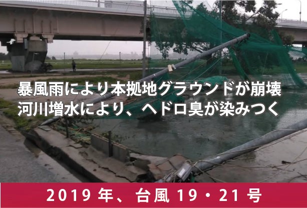 2019年10月、超大型の台風19号・21号の暴風雨は、淀川河川敷にある練習グラウンドに、大きな大きな爪痕を残しました。他に練習させてもらえるグラウンドを必死に探す一方で、大人たちで土を入れ替えたりフェンスを立て直すなど、必死の復旧作業にあたりました。