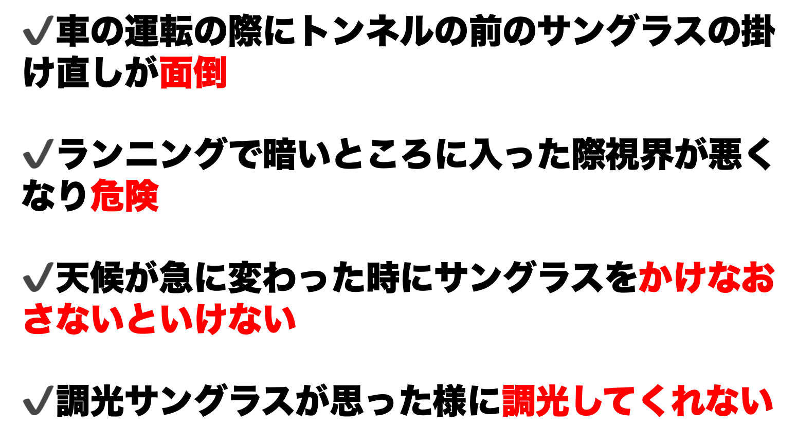 トンネルの出入りの際の面倒な掛け替えが不要、スイッチによる操作が不要、偏光機能によりトンネル内の眩い光をカット&しっかりと見やすさを確保、視界がはっきり見える事で道中に小さな障害物があっても視認し回避