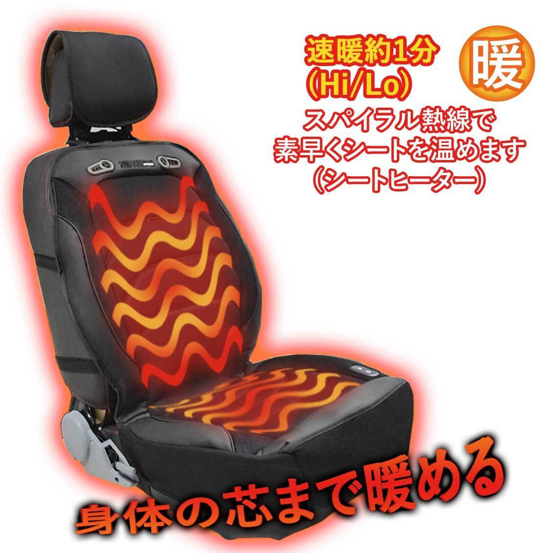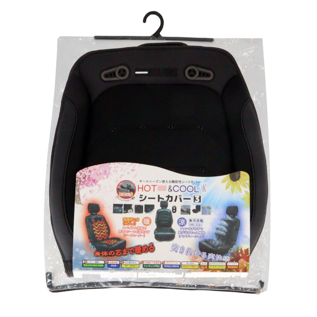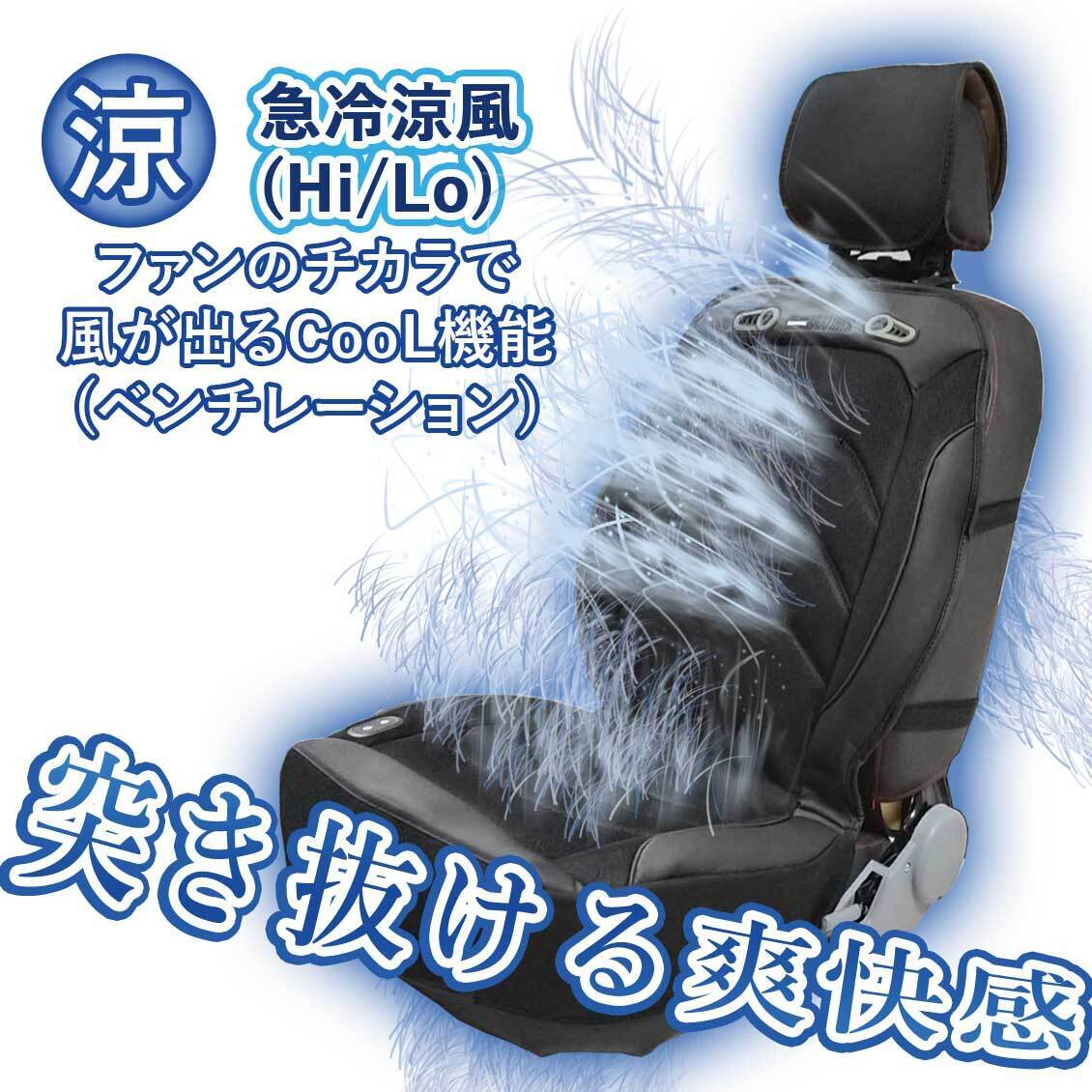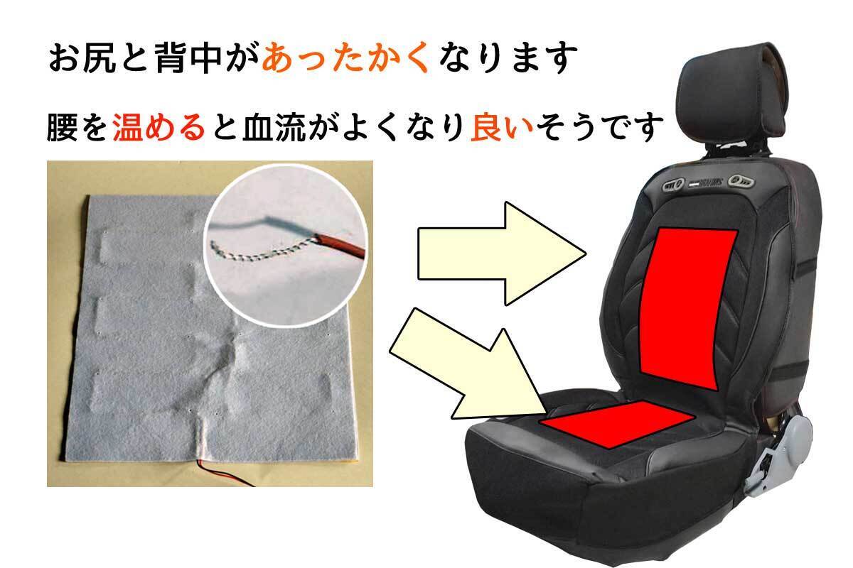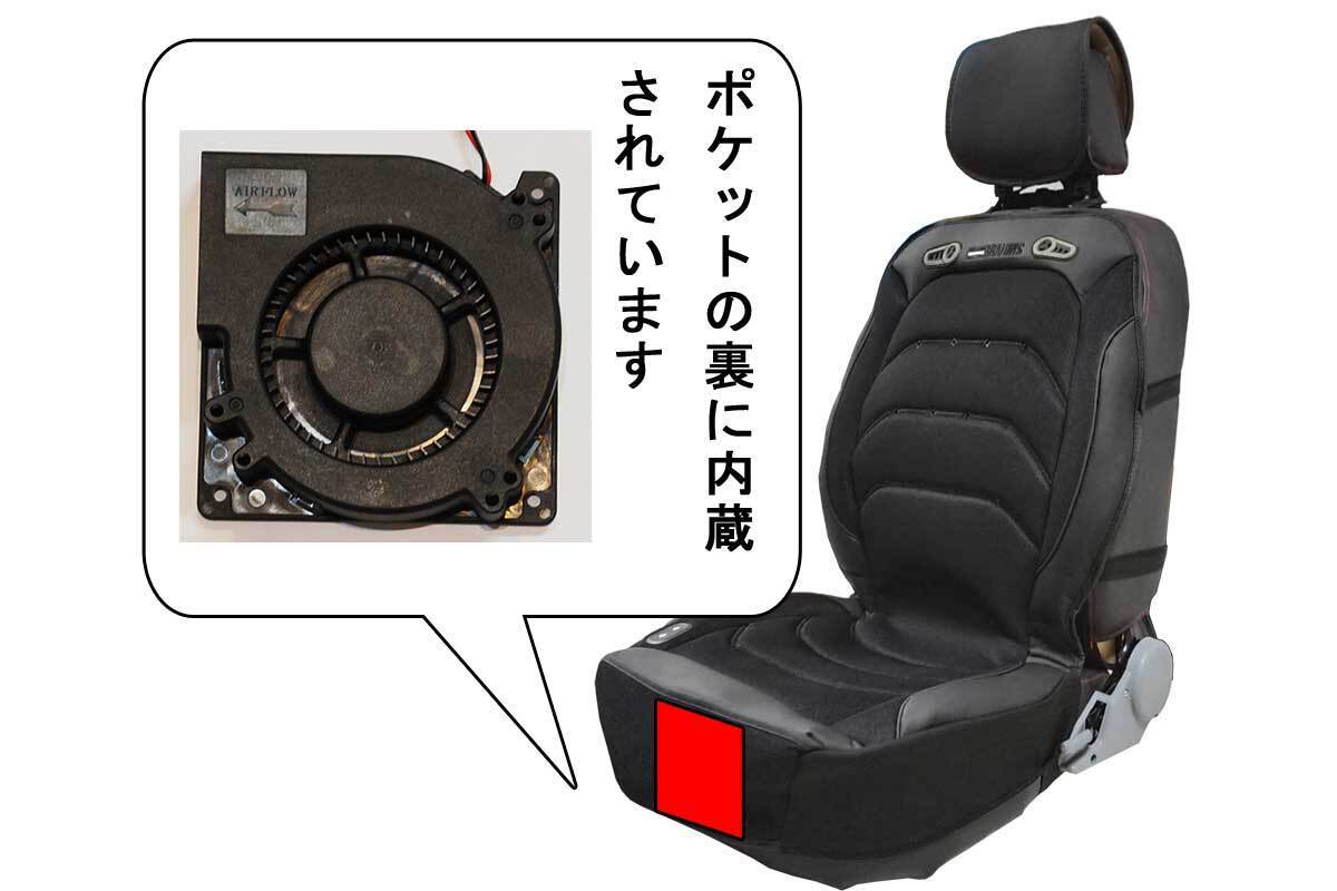 シートカバーに熱源となる「電熱線」と風を起こす「ファン」を付け、「10mm」のウレタンクッションを内蔵させ、快適性をとことん追求したシートカバーとなっております。