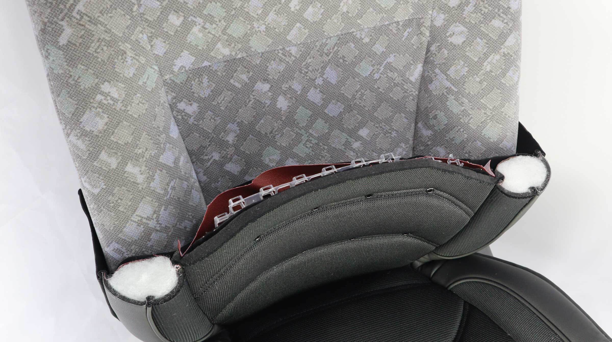 ③デザイン性=触れにくい部分にPVCレザー+Wラッセルのラインデザイン+立体縫製