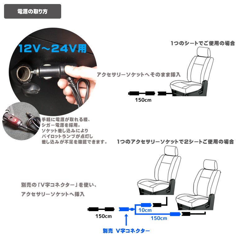 注意…1つのアクセサリー電源から本体シートを同時に使えるのは2台までです。それ以上使いたい場合は、別のアクセサリー電源が必要です。(多くの車で電源供給の最大は10A/口のため)