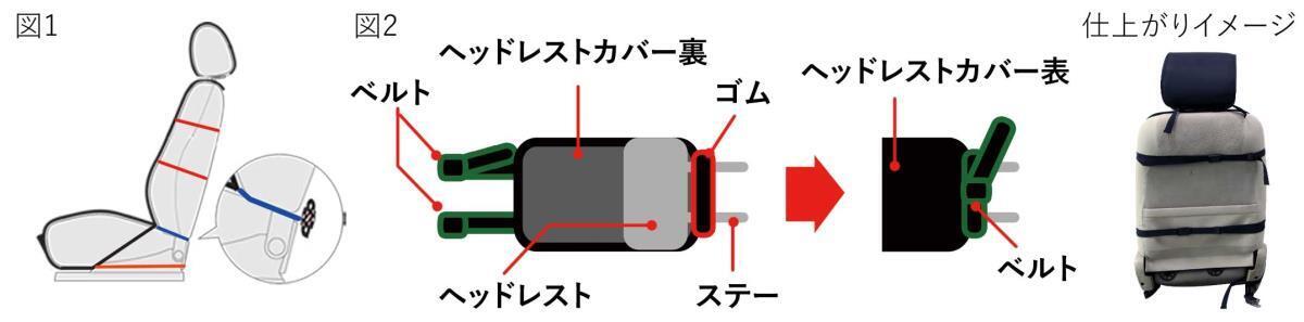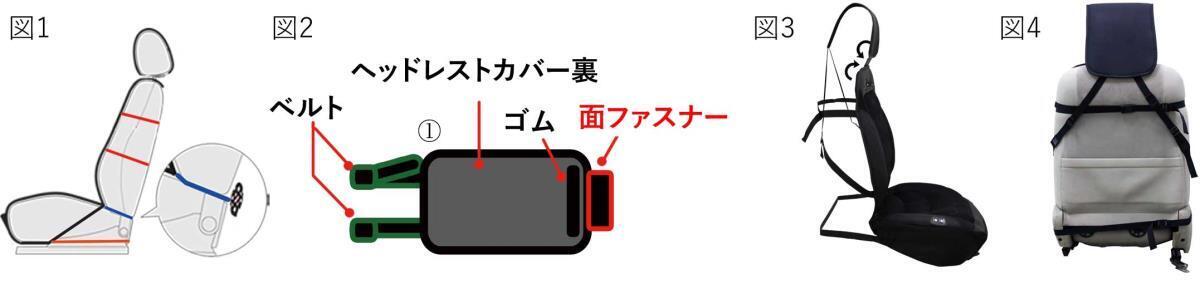 ②ヘッドレストが面ファスナーAと背面面ファスナーBを上図①②を参照に固定します。