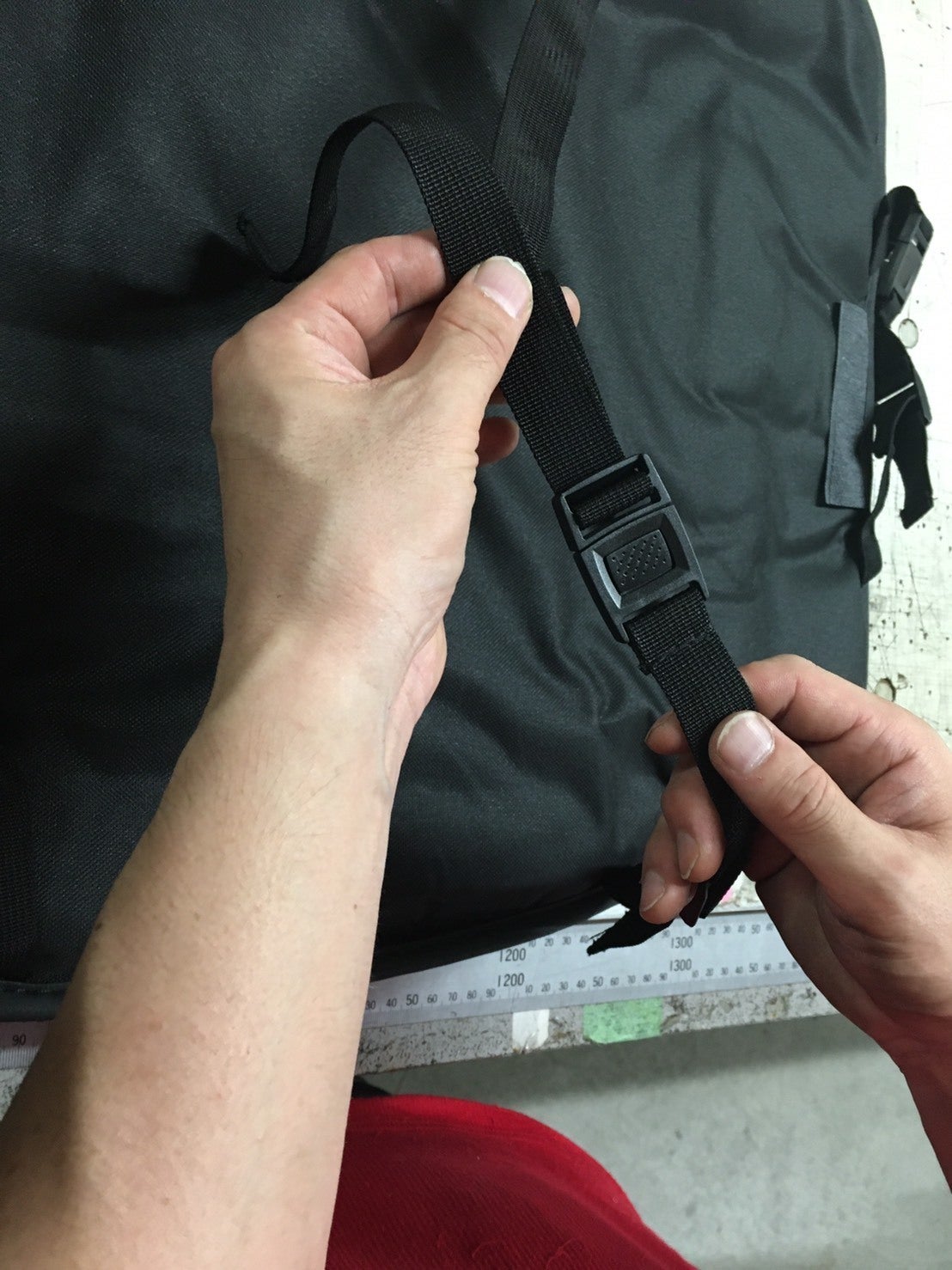 ②2箇所の背面ベルトを水平に固定し、取り付けベルトで固定して下さい。