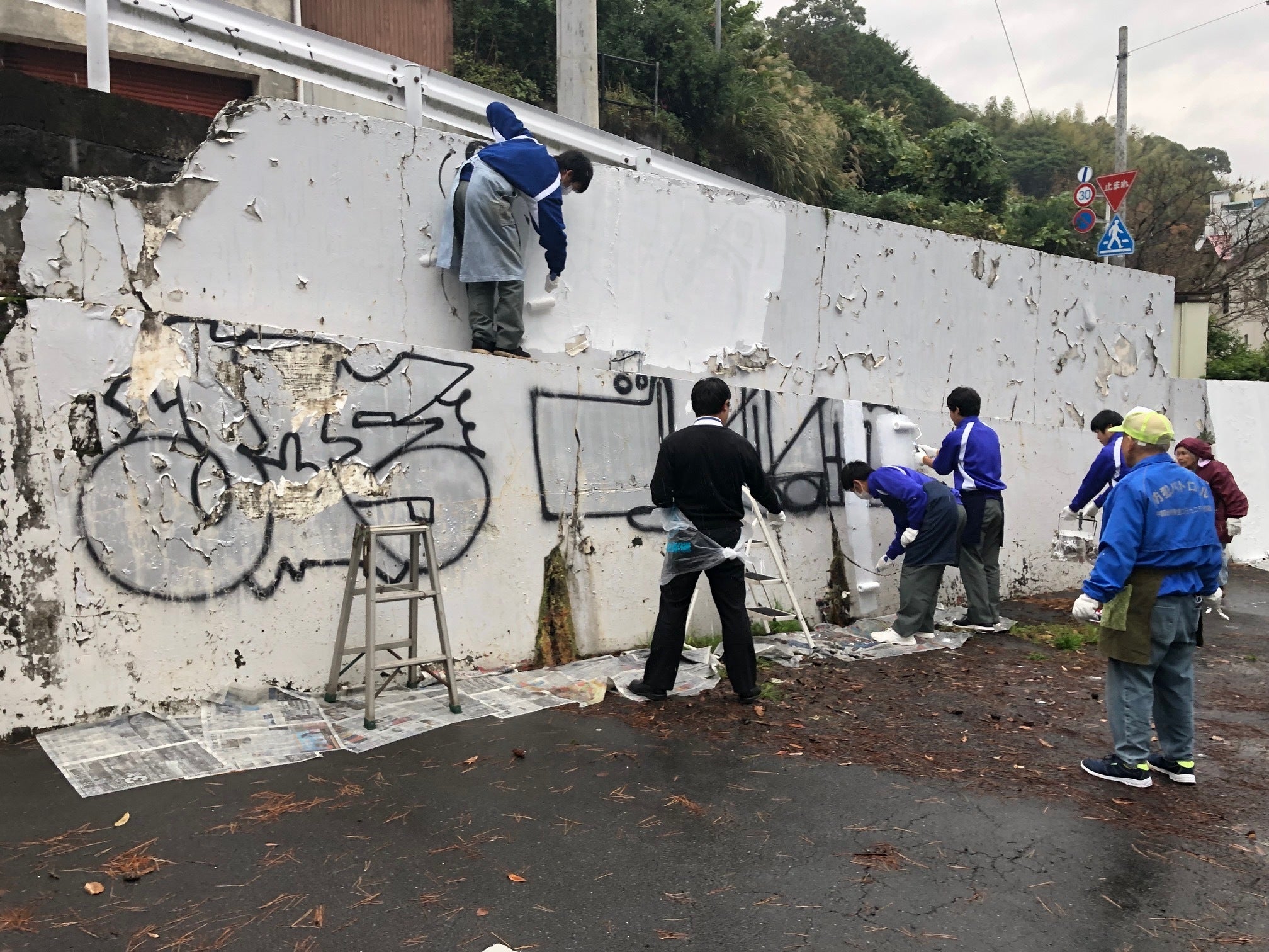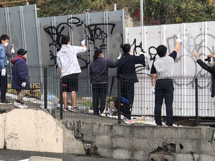 しかし、辛抱強く、そして、あきらめることなく、再び被害に遭う可能性もゼロではありませんが、それでもこの消去活動を続ける必要があります。また、落書き消去活動では地元高校ボランティア部の生徒さんにご協力をいただく機会にも恵まれました。落書きは言うまでも無く犯罪です。大きな社会問題であることも高校生の皆さんと認識をこの活動を通じてしっかり共有できたのではないかと思っています。