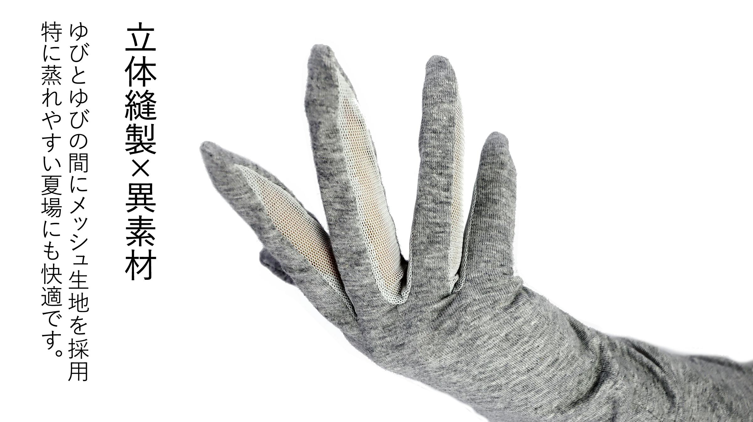 これから暑くなってくる中で、快適につけれるように通気性を考慮して、指と指の間にメッシュ生地を入れることを思いつきました。もちろんUV効果もあったほうがいいな。