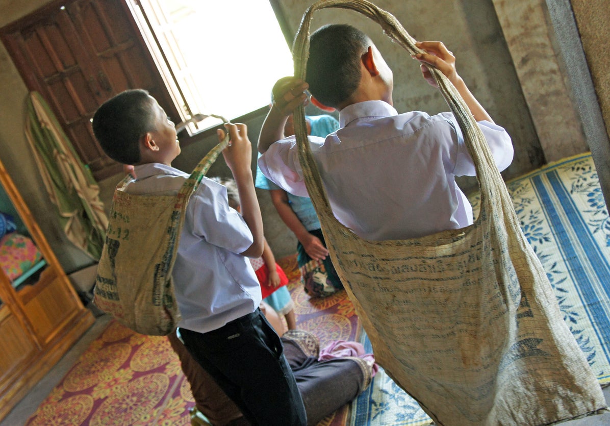私たちが開設した学校図書室で出会った双子の兄弟、チュン君とチェン君の話をします。ふたりが住む、ヴィエンチャン県ムーン郡は首都から車で5時間、海抜300メートルほどの田畑の多い丘陵地です。私たちは2015年に、ふたりが通うナムプーン中等学校に図書室開設の支援をしました。チュン君チェン君をはじめほとんどの生徒は、この図書室で初めて教科書以外の本と出会いました。読書の楽しさを知ったチュン君チェン君は毎日図書室に通い、1か月に16~7冊の本を借りているとのことです。おばあさんと暮らすふたりの両親は、彼らが2歳の時に離婚し、それ以来、お父さんとは音信不通、お母さんはタイに出稼ぎに行っていて、年に一度の帰省の時にしか会えません。休日には、片道2時間かけて山道を歩き、畑へ行き、唐辛子の収穫を手伝います。収穫した唐辛子は、大きな袋に入れて、頭や肩に引っかけて、山から持ち帰ります。そして小分けにして、市場で売ったり、近所の家々をまわり売り歩いたりするそうです。唐辛子の運搬方法を実演してみせてくれました。好きな本について尋ねたら、チェン君は、ラオスの民話『カンパーと歌うジャコウネコ』と答えました。「主人公のトンとジャコウネコが、村の人を喜ばせるシーンがかっこよくてワクワクする!ぼくもトンみたいに優しく立派な大人になりたいんだ」と元気よく話してくれました。主人公に自分を重ねて、勇気をもらったそうです。チュン君は、もぞもぞしながら小さな英語の絵本を手にしていました。アメリカのテレビ番組「セサミストリート」のキャラクターが表紙になっている薄い絵本。私たちの団体がご寄付でいただいた絵本を図書室に置いたものでした。小さな子ども向けの絵本なので、中学生としては、ちょっと照れくさかったのかもしれません。「えっと、この子はエルモっていってね、色々なところへ行くんだ。」と、本の内容を一生懸命に説明してくれました。「もっともっと英語を勉強して、色々な外国の人と話せるようになりたいんだ」とのこと。「英語話せる?」ときくと、「うん、ちょっとだけ・・・・・Nice to meet you!」1冊の本との出会いが、世界への扉を開けて、翼となって、彼らを飛び立たせるようにみえました。そんな彼らの姿に私たちも勇気をもらっています。