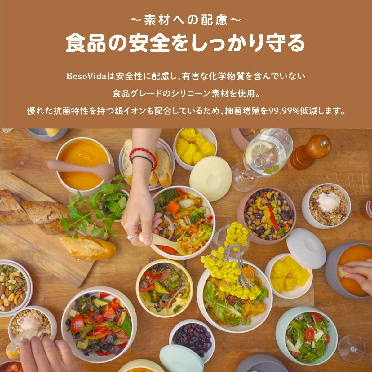 ベソビダは、調理器具にも保管容器にも食器にもなる万能抗菌シリコンボウルです。