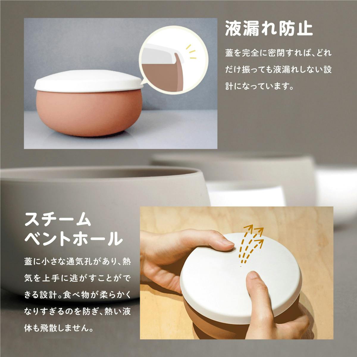 蓋に小さな通気孔を設け、熱気を逃がし、食品が柔らかくなるのを防ぎます。