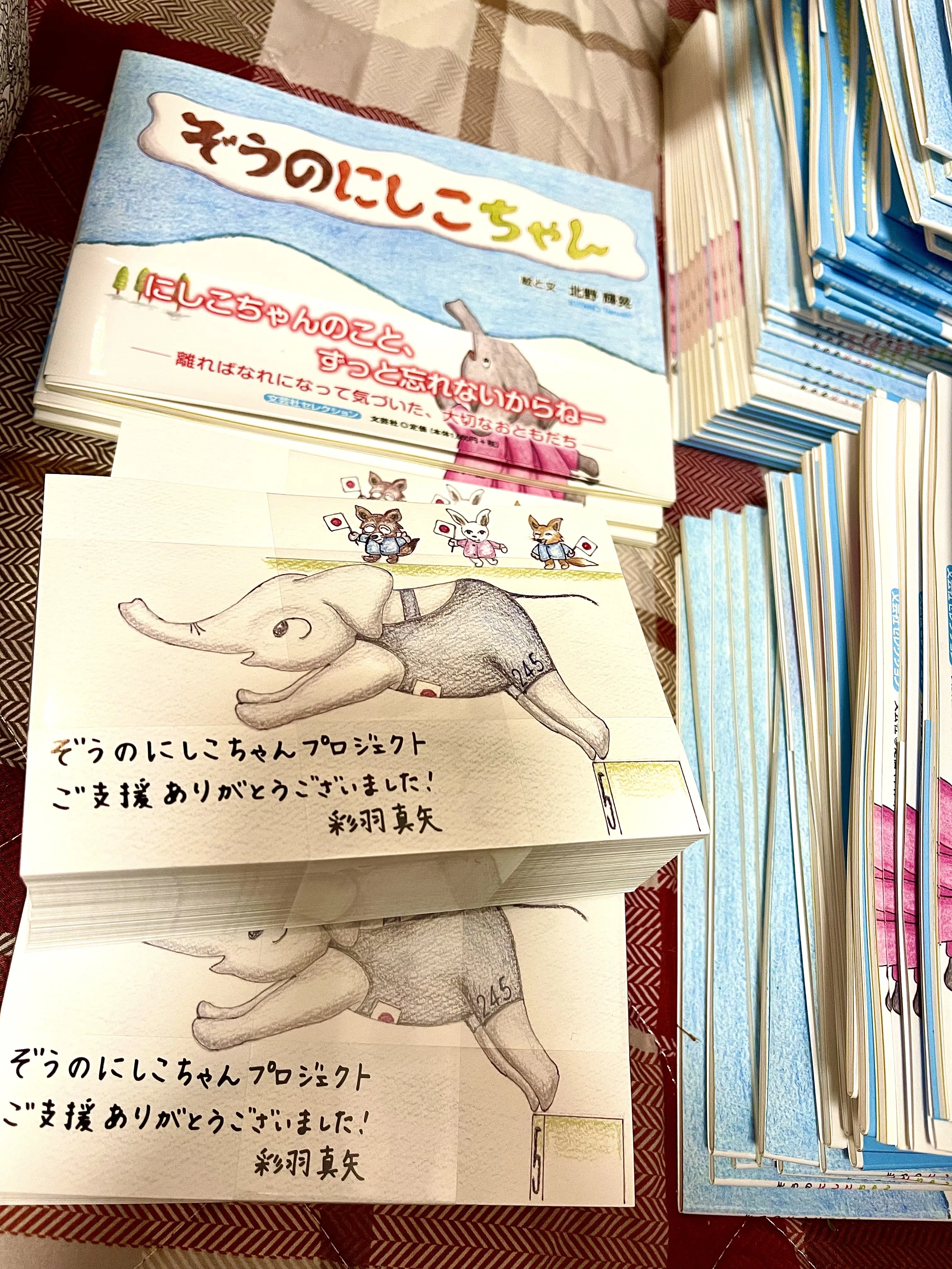 父にお願いして、このためだけに描き下ろしてもらったぞうのにしこちゃんポストカードを同梱させていただいています。