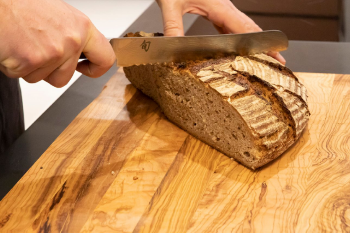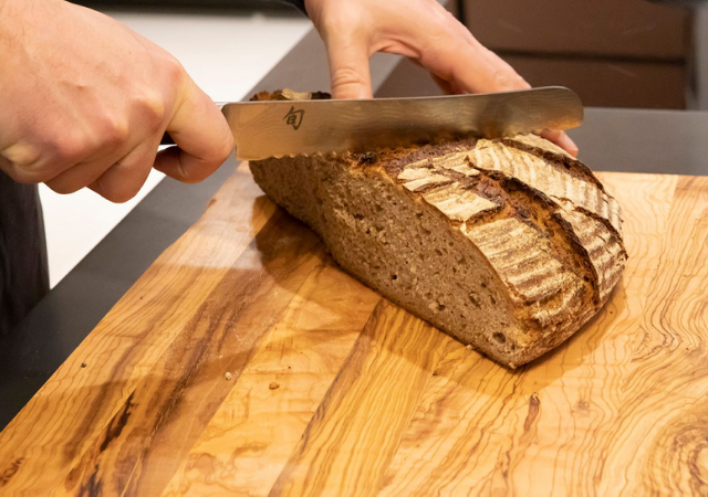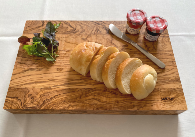 オリーブ材は他の木材(オークやブナ等)よりも密度が高いことから硬く耐久性に優れているため、波刃タイプのパン切り包丁でも傷つきにくいです。
