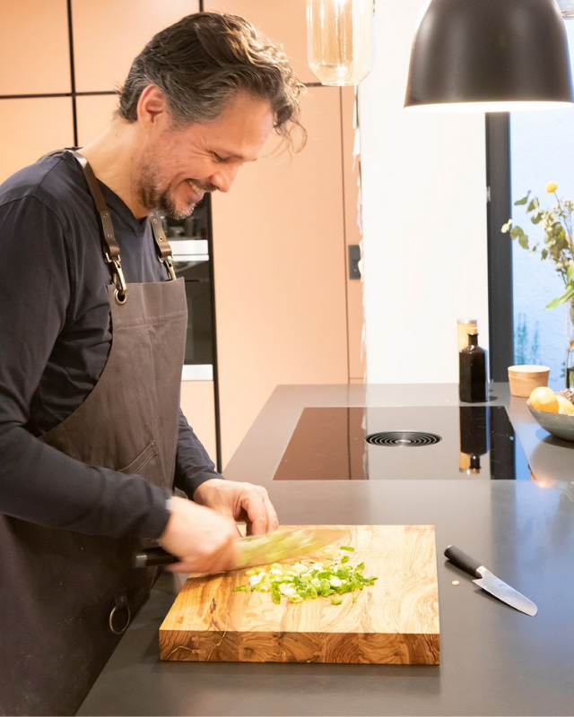 このBENNYを見つけた瞬間、大理石を連想させるような「厚さ4㎝」もあるオリーブ材のまな板の圧倒的な存在感にとても感動しました。厚み4㎝もあるオリーブ材のまな板は他探してみましたが、なかなかありません。温かみのある色合い、ユニークな木目は装飾的で樹齢150年以上の貴重な木の魅力でもあります。