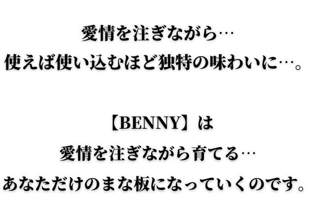 熟練した伝統的な職人が作り上げたまな板【BENNY】の存在感には圧倒されます。使えば使い込むほど味わいが増し、天然木の温かみを感じて頂けるかと思います。