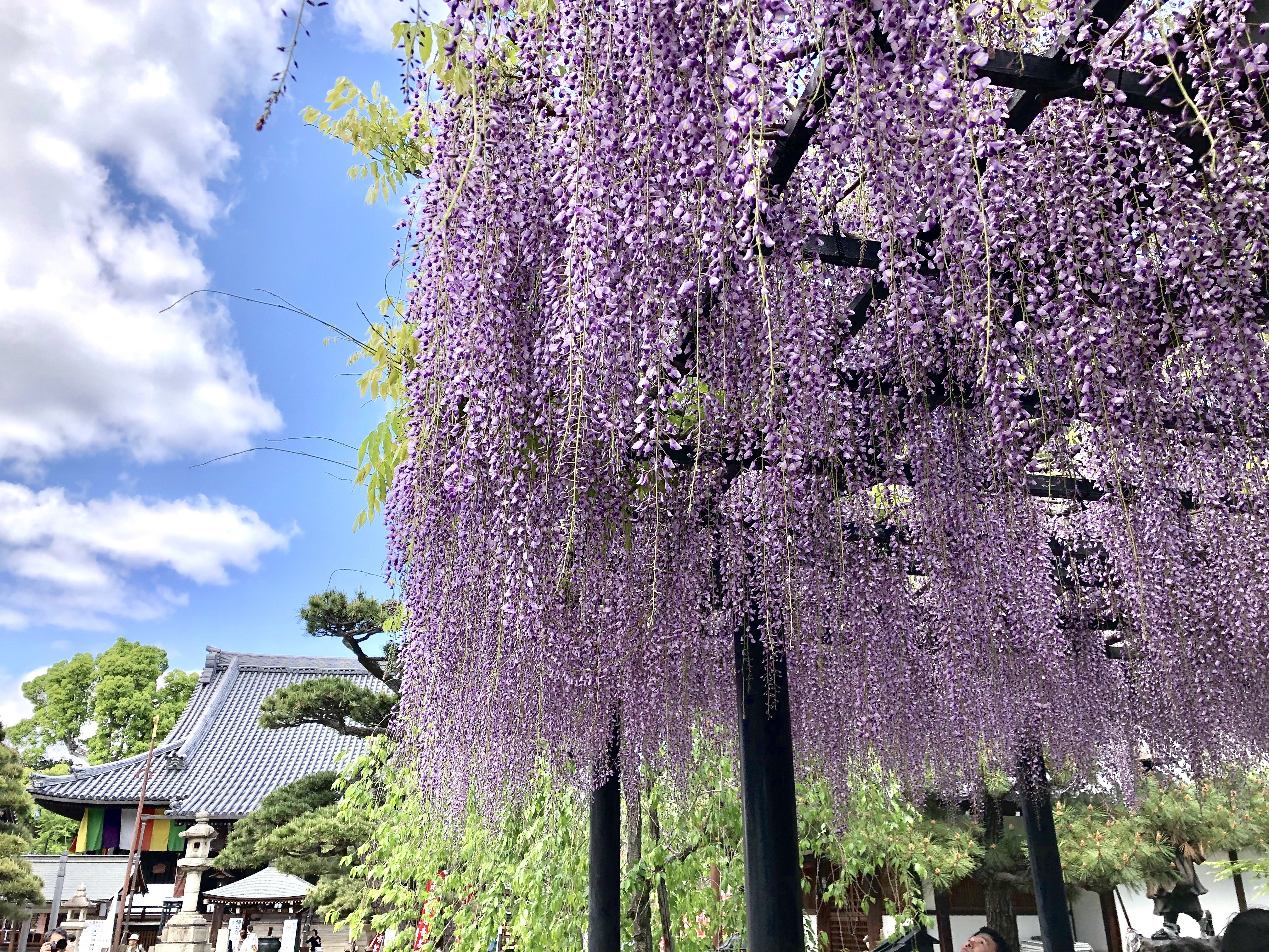 葛井寺(ふじいでら)は古代氏族葛井氏の氏寺として、7世紀中頃の白鳳期に建立され西国三十三所観音霊場の第五番札所として広く信仰をいただいております。 本尊の千手観音菩薩坐像は国宝に指定されており、頭上に十一面をいただき、錫杖(しゃくじょう)や宝輪(ほうりん)、数珠(じゅず)などをもつ「大手」と、孔雀のように拡がる1001本の「小手」、そして正面の合掌手を合わせ、実際に1041本の手をお持ちの観音様です。千本以上の手を持つ千手観音は我国では唯一と言える遺例で、端正な顔つきに、のびやかな肢体、そして千手という超人的な姿を自然な調和をもってあらわした像容は天平彫刻の粋を集めた観音像です。また、 四脚門は豊臣秀頼による寄進で、桃山様式をよく伝える建造物として国指定重要文化財となっています。 境内には紫、白、ピンクの藤棚があり毎年4月には満開の藤の花が咲き境内が甘い香りに包まれます。