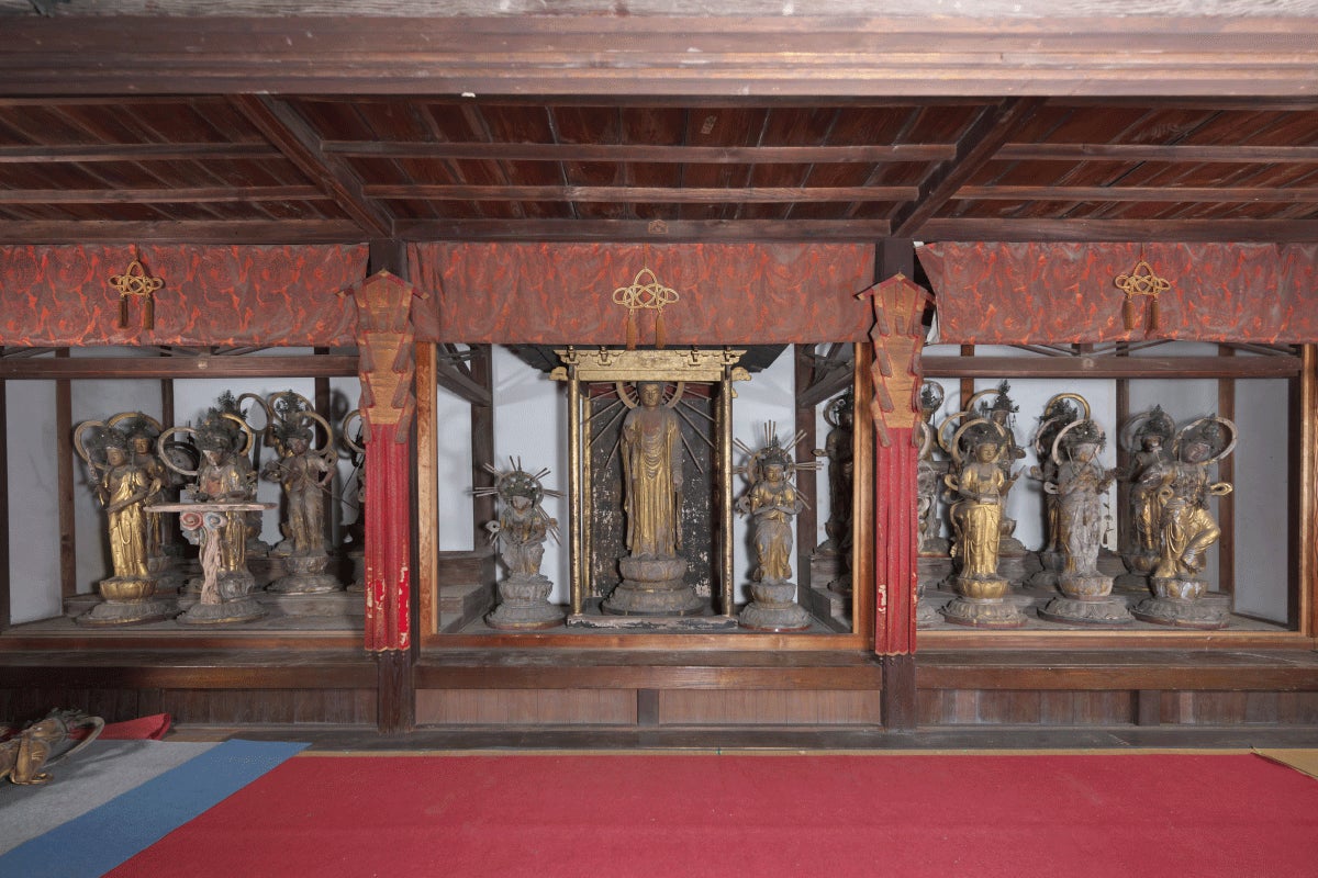 本尊は実際に千の手を持つ国宝の千手観音菩薩坐像で多くの方々にご信仰をいただいておりますが、実はもう一つ文化財として未来へ繋げるべく仏像(群)がいらっしゃいます。それは、阿弥陀如来を中心に27体の菩薩がそれぞれ楽器を奏でオーケストラを形成する「阿弥陀二十五菩薩迎接像(あみだにじゅうごぼさつごうしょうぞう」です。迎接(ごうしょう)とは仏教用語で、ほとけ様が臨終の際にお迎えに来られ、極楽西方浄土(西の彼方にある仏様の住む極楽世界)へ導くという意味があります。つまりこの像は阿弥陀如来と二十五菩薩による迎接の様子を表している像群なのです。