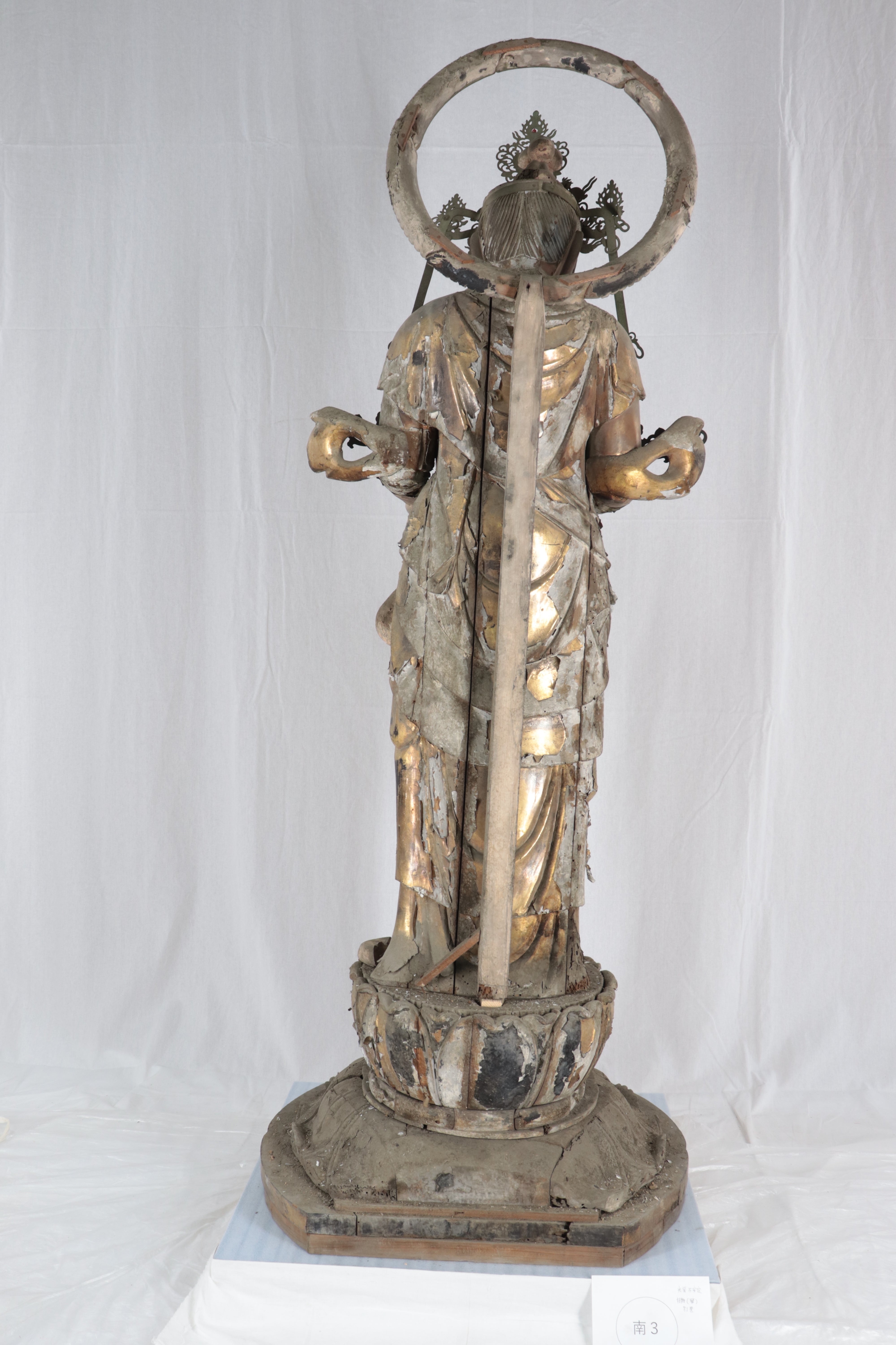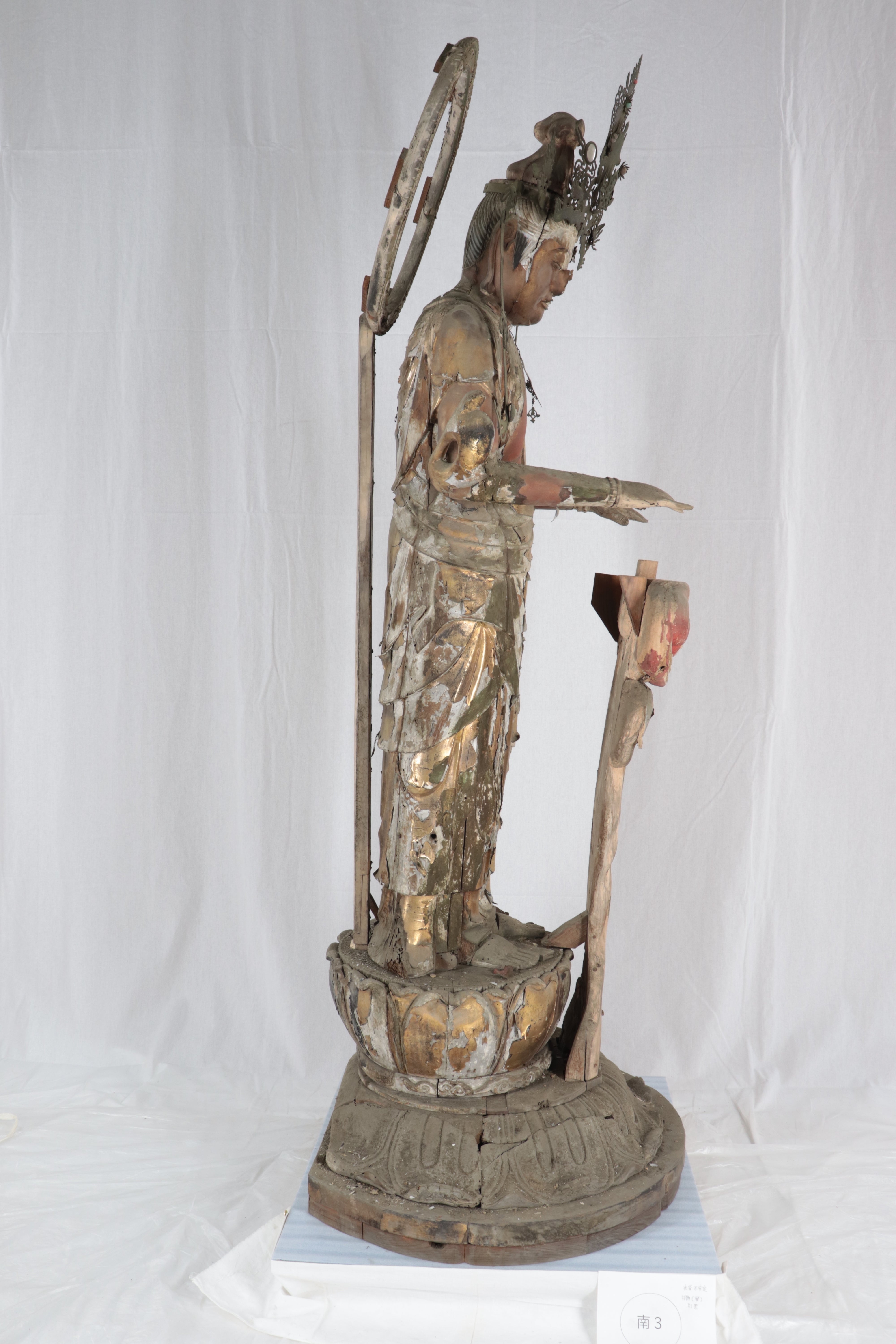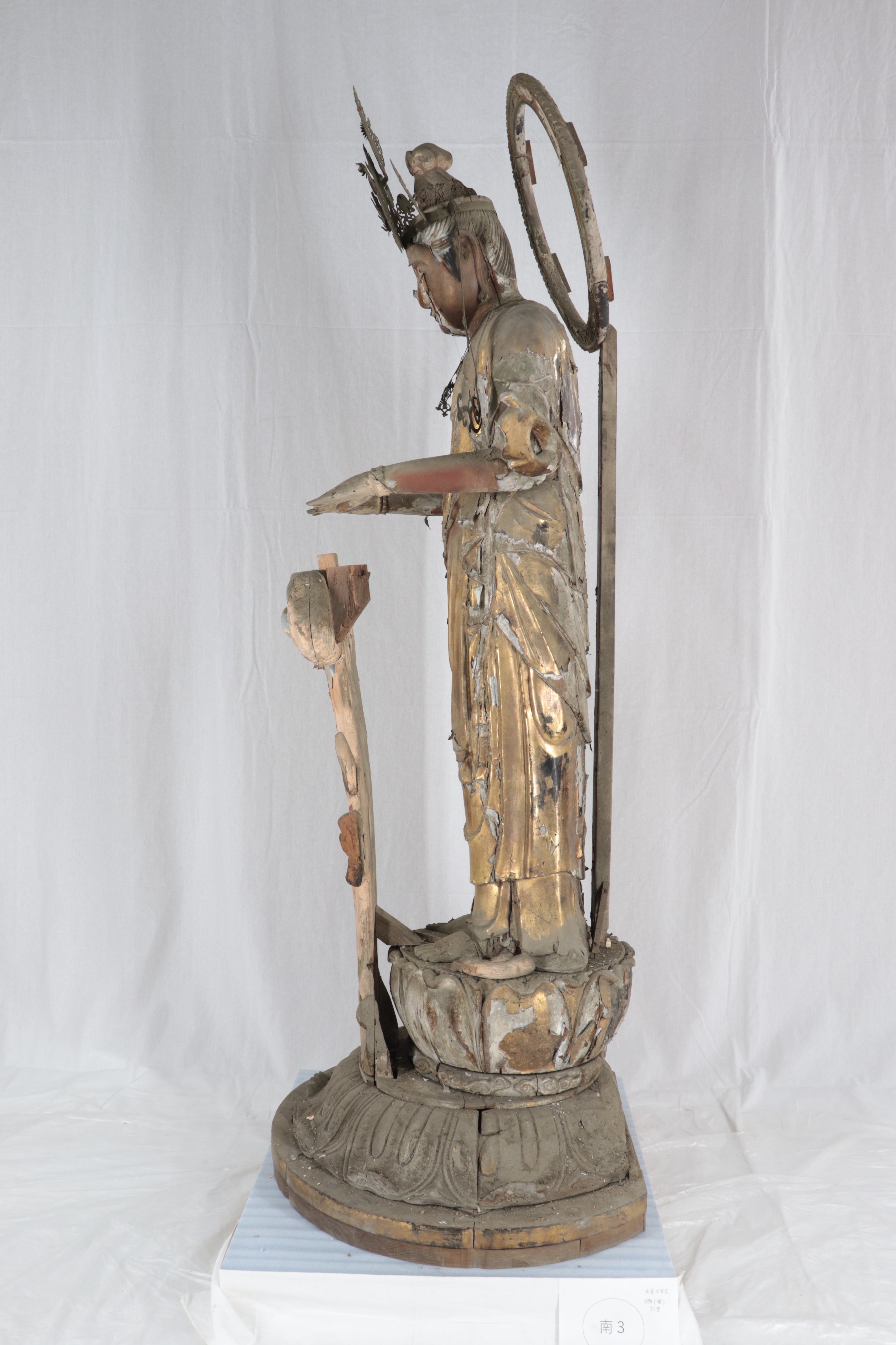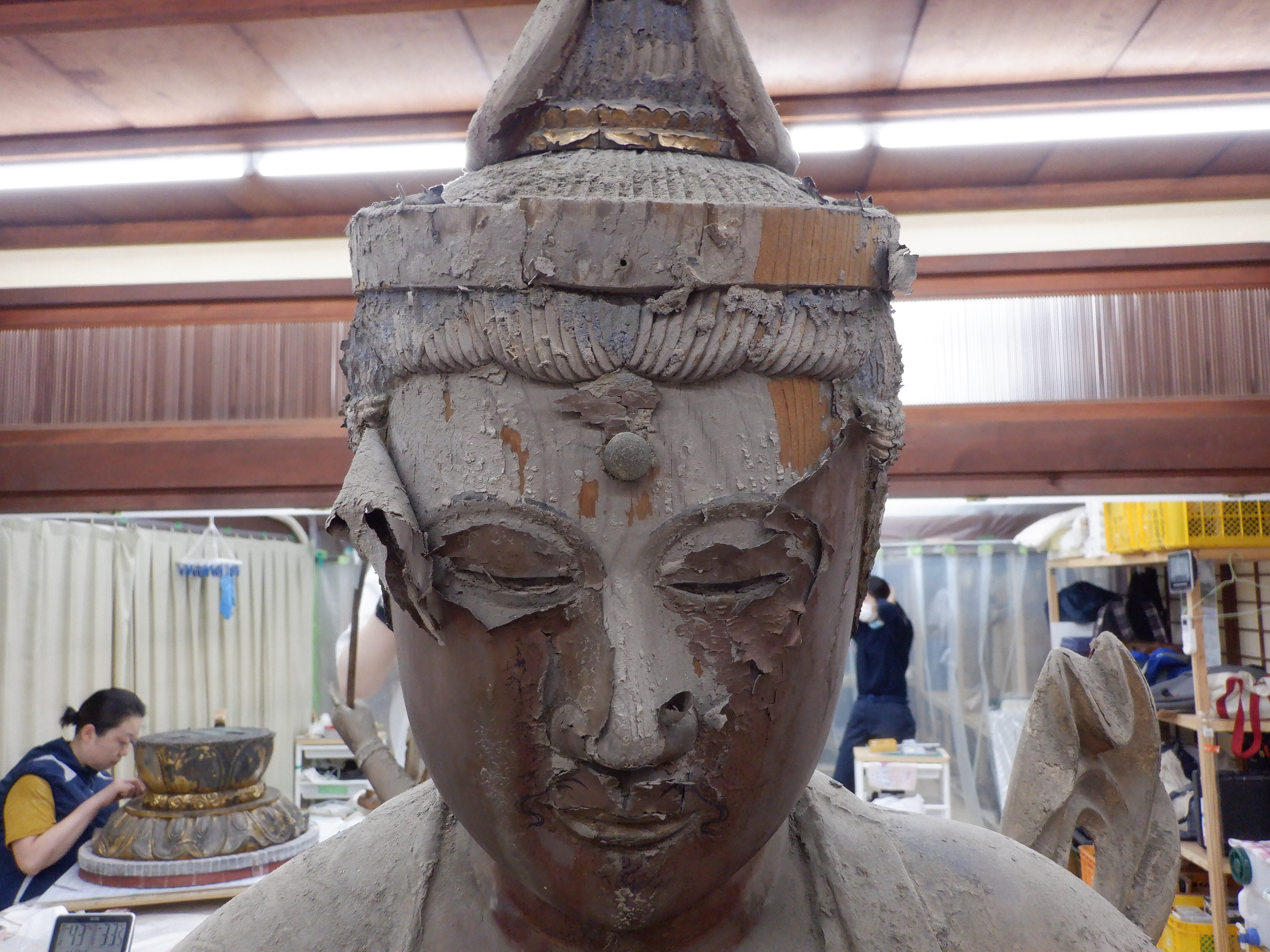 全ての御像には剥離や剥落が見られ尊容を害している状態です。仏像が造立された当初の綺麗で美しい御姿に戻すのであれば金泥彩や剥落部分はすべて取り除き、木地を表し漆箔等は施工しない方法(修復作業としてはこちらの方がシンプルで簡単)もありますが、剥落や欠損にも数百年間人々を見守り続け、耐え抜いてきた仏様と人々の歴史が詰まっていると考えます。傷ついた部分を拭い取るのではなく、それも丁寧元の状態へと戻すことが、歴史保存へと繋がっていくのではないでしょうか。敢えて難しい修復作業を選択する形にはなりますが、今までの歴史を守り大切に伝えていく所存です。
