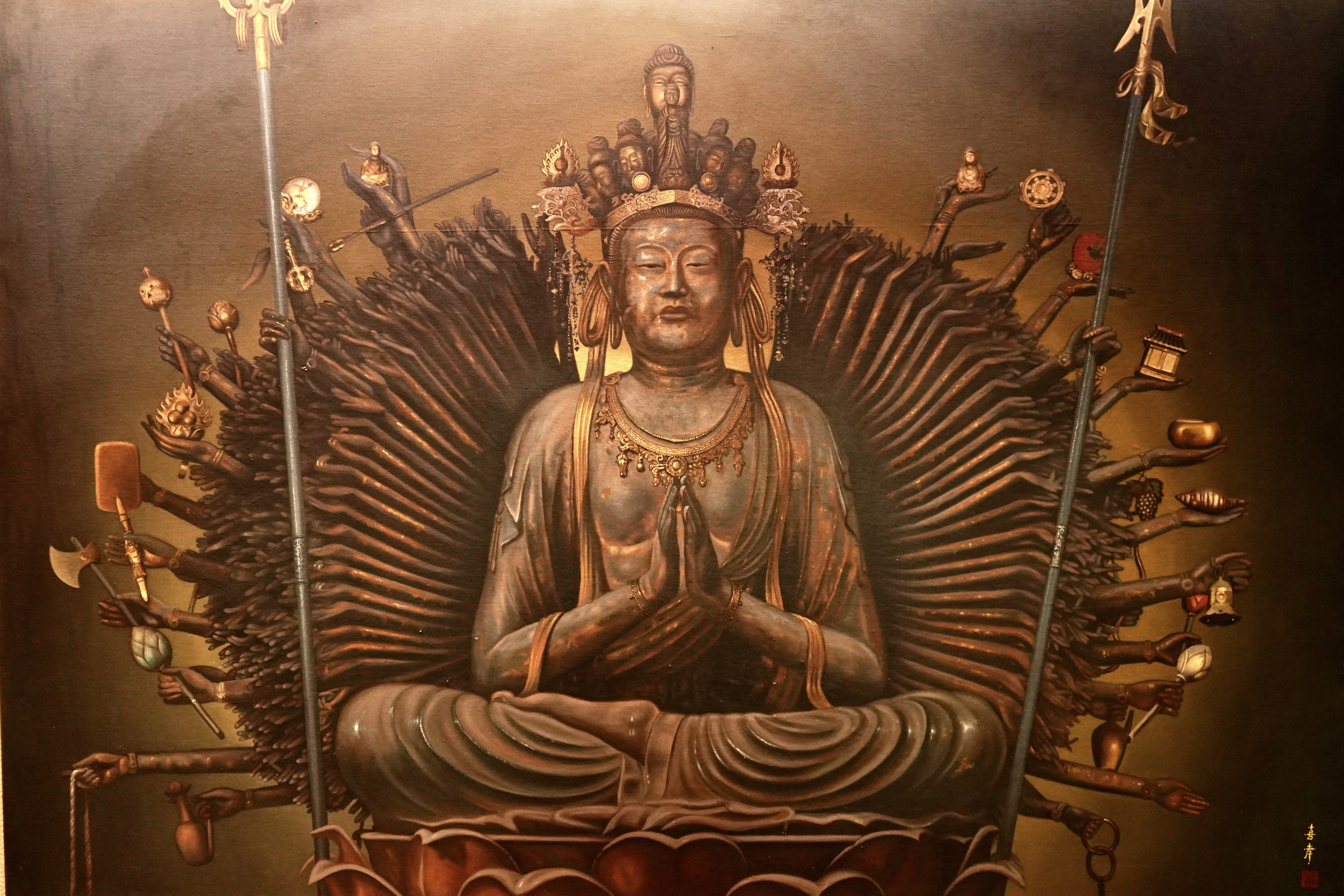 今回修理に携わらせて頂きます余江と申します。拝見させて頂いた仏像の保存状態ですが、安置されていた建物の雨漏りなどの悪条件の環境下と経年劣化によってかなり傷んでいます。特に表層の金箔がひどくめくれ上がっている箇所が無数にあります。そもそも、その金箔は漆が塗られた上に貼られているのですが、通常の修理方法であればめくれてしまった箇所は全て除去して新しく漆を塗り金箔を貼り替えるのが主流です。更に広範囲にめくれ上がった金箔を元に戻すことは難しいと考えられていますが、今回の修理は他では殆ど見る事のできない手法で修理を行います。