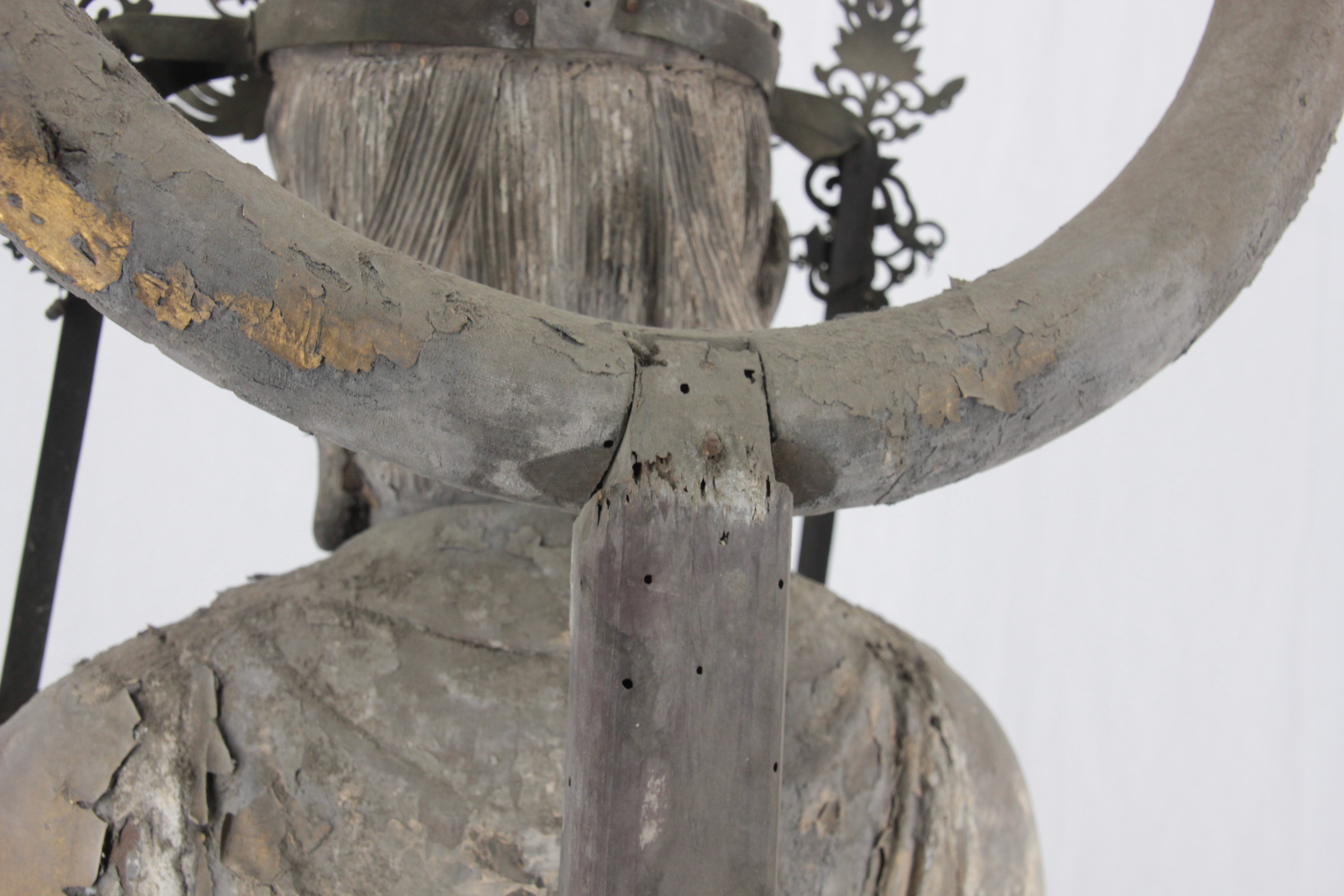 2023/03/04 12:00定自在王菩薩です。塗膜が剥がれた状態は何度見ても痛々しく、申し訳ない気持ちになります。今回のプロジェクトも最終の最終を迎えましたが、改めて修理師さん、仏師さんの技術の高さを知りました。剥落止めをして塗膜を元の状態に戻すだけで随分と綺麗なお姿に戻られました。本来のお姿に戻りつつありますが、これから金箔をつけ、古色をします。 もっと見る光背(こうはい)