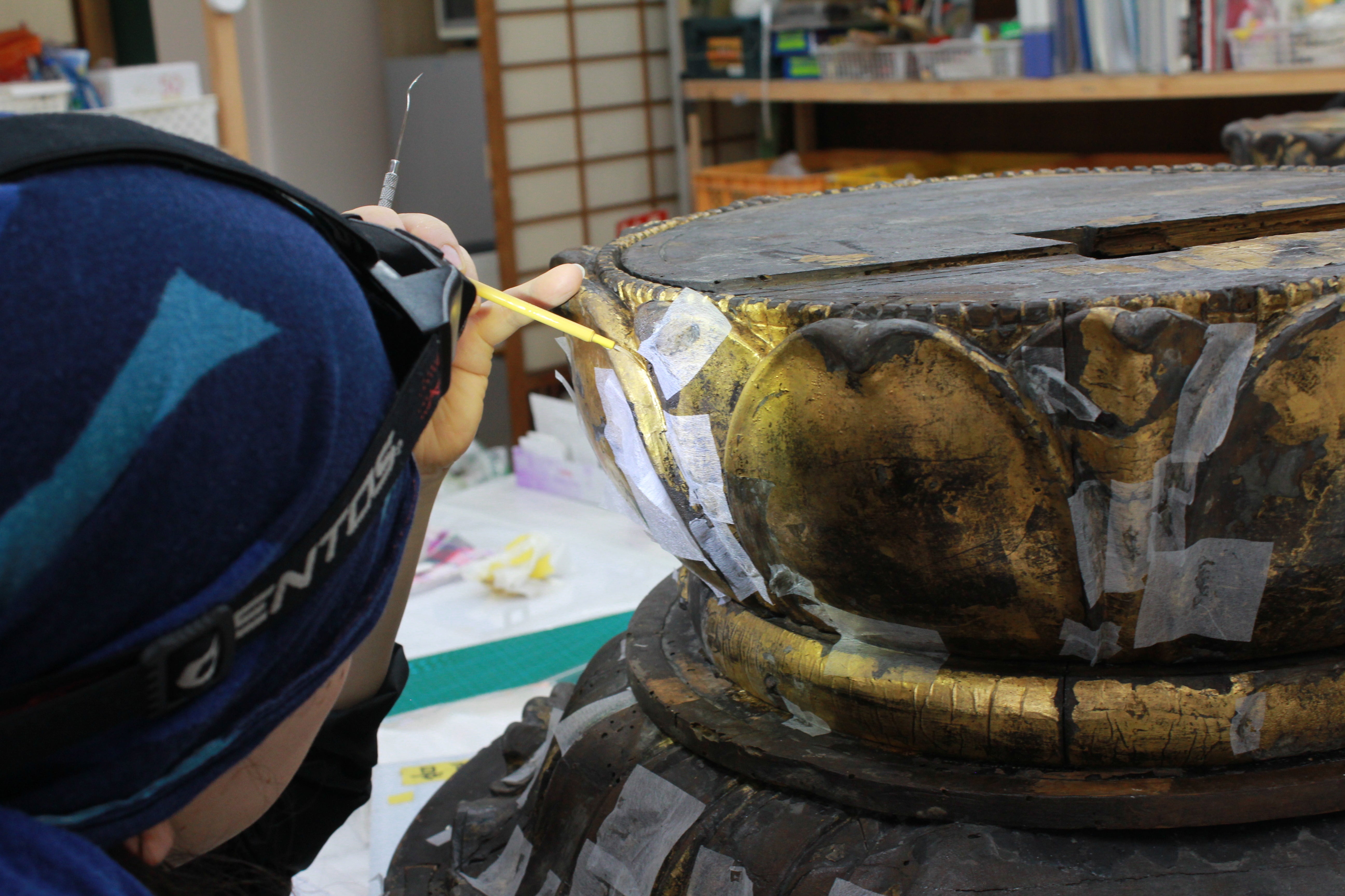 台座ももちろん修理をしています。台座も塗膜が剥がれて酷い傷みでしたが、ほこりを落とし剥落止め、そして欠損部分を足していきます。膠水(にかわすい)を塗っていきます。膠は動物性の接着剤です。欠損部分が足されました。蓮弁が綺麗な状態に戻りました。