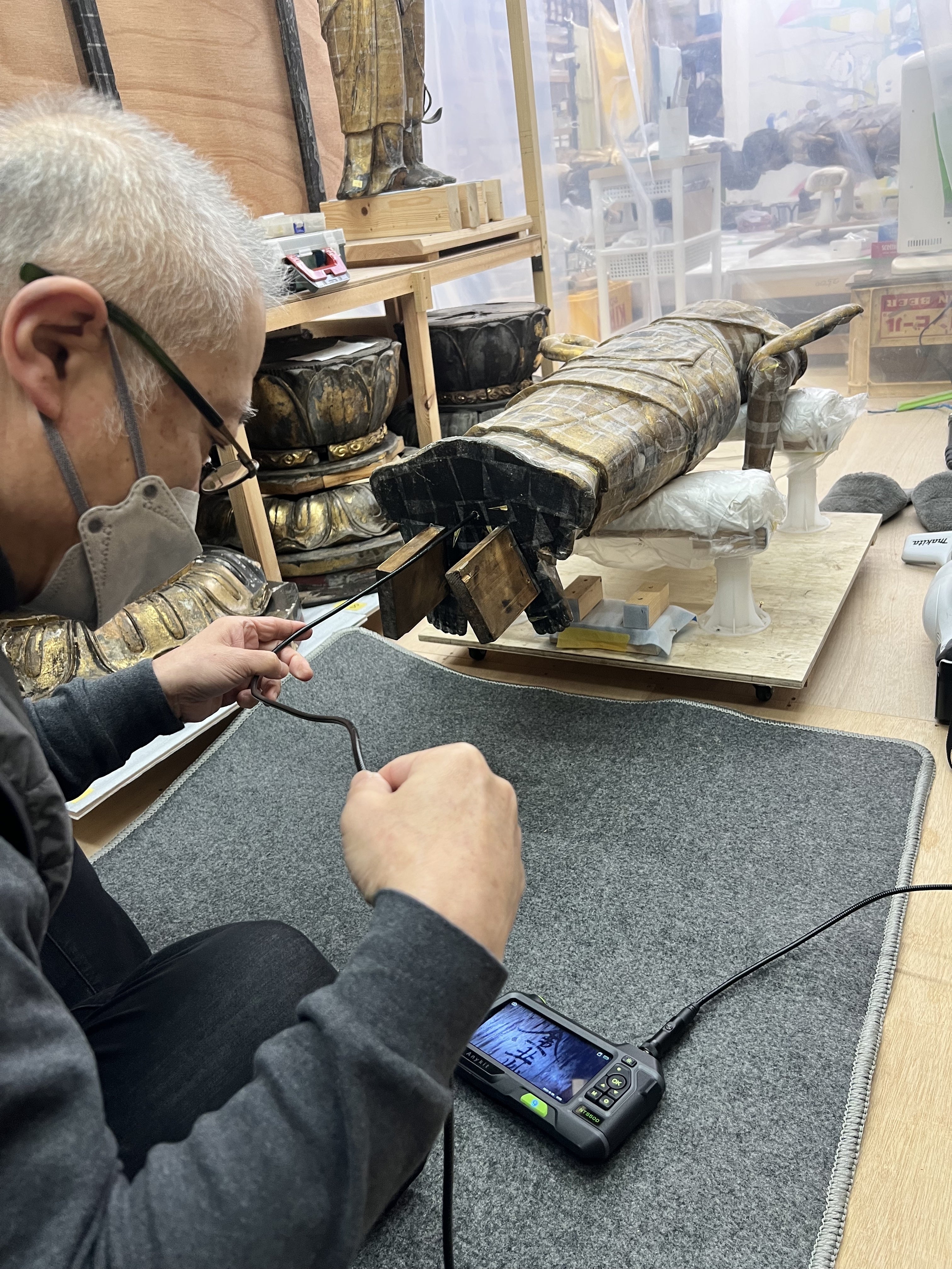 仏像の足のさらに裏側の数ミリのほぞ穴からファイバースコープを挿入します。