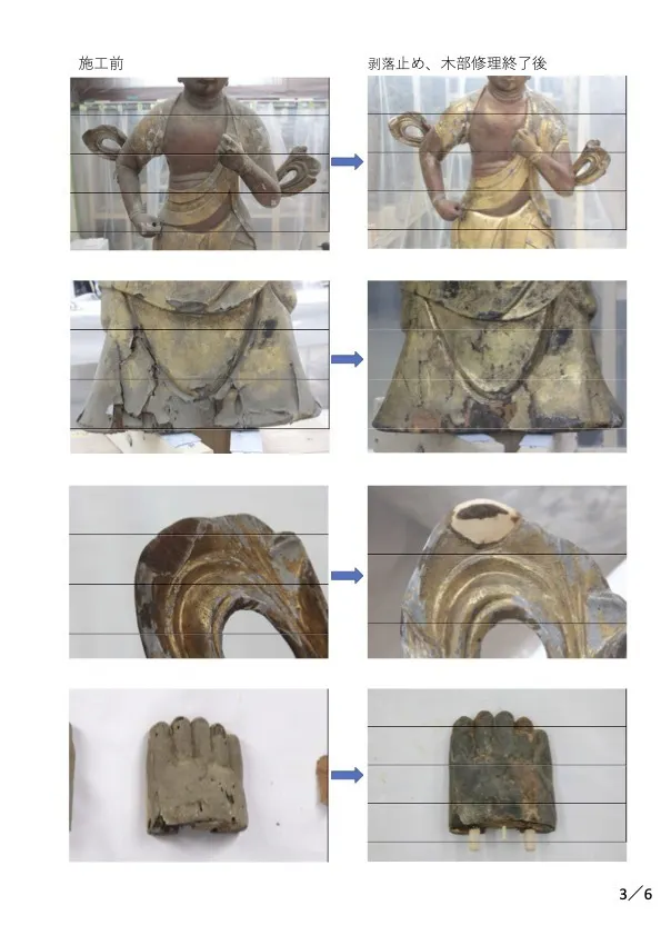 気の遠くなるような剥落止めの作業を丁寧に繰り返し、木部修理(腐食した部分をくり抜き新しい材を入れる)を経て、元のお姿に戻りつつあります。