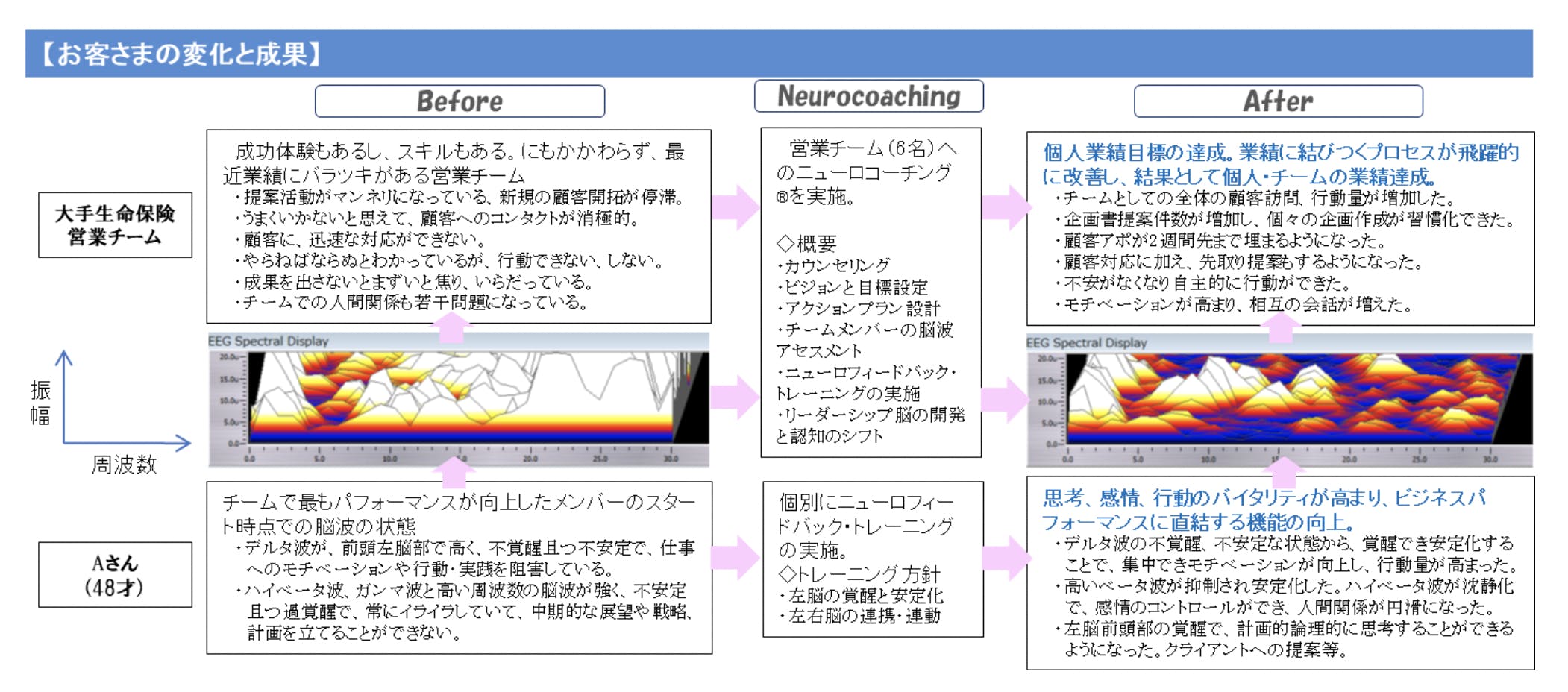 会社の文化と異なる新規事業のため周囲からのサポートが得られず、社長からは強いプレッシャーから、メンタル不調となり週に2~3日休むようになり、夜は眠れず、企画なども書くことができず、モチベーションも低下していた。ニューロコーチング®を受け2か月でサクサク仕事できるようになり、クライアントと部下が「最近部長変わったね、活き活きをしている」と話題になった。