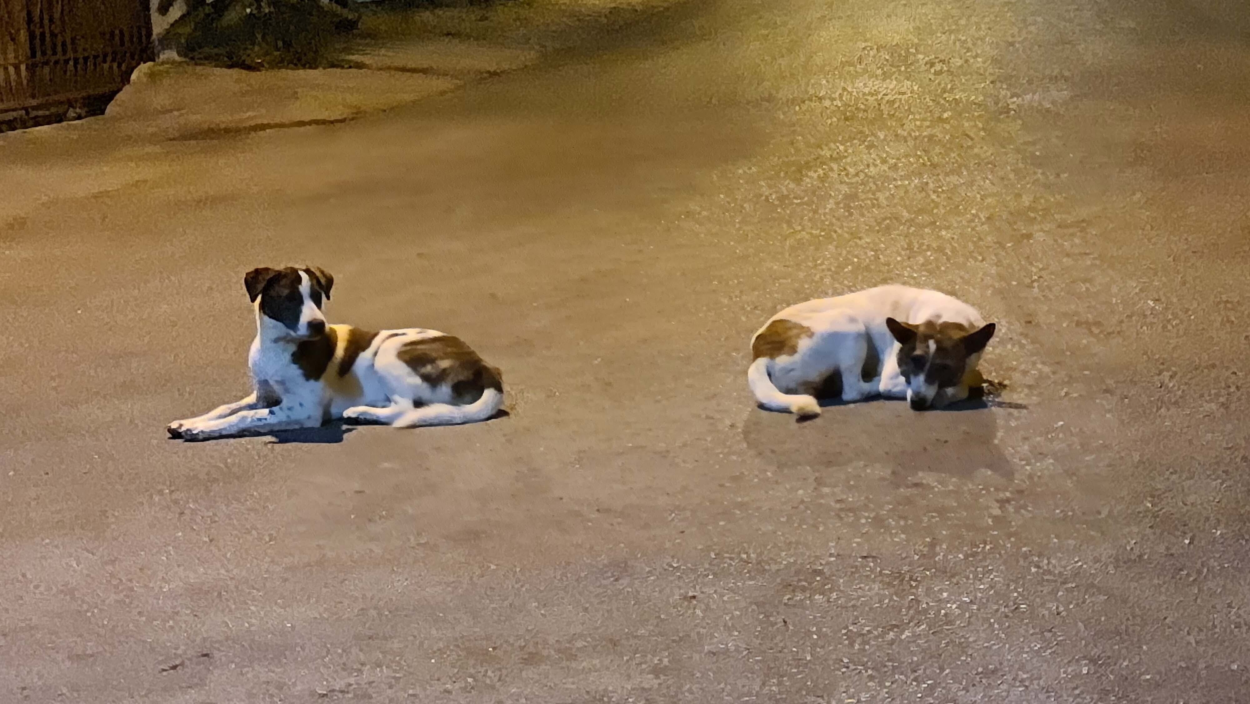 夜、道の真ん中で堂々と座っている大型犬2匹。タイでは普通の光景です。