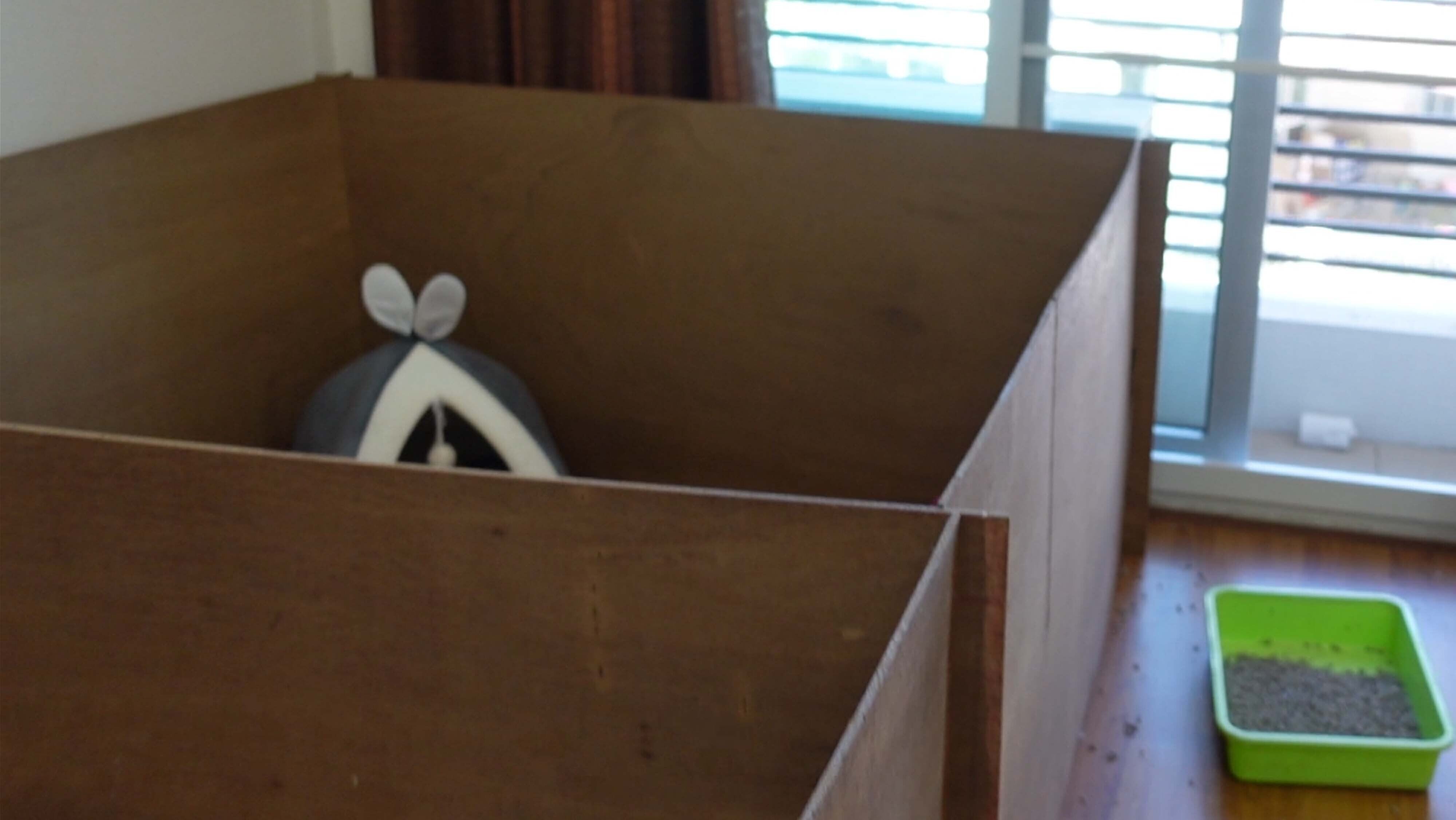 現在は木の板で四方を囲っているだけなので、生後1ヶ月半ぐらいになるとジャンプして飛び越えてしまいます。