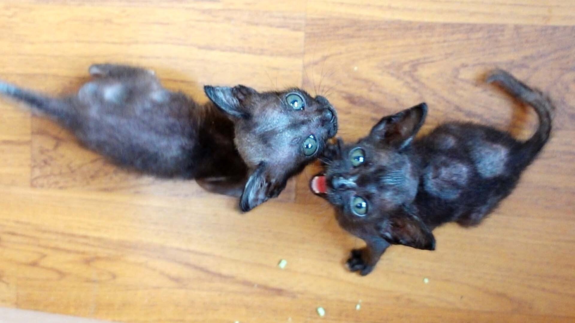 猫カビになってしまった黒猫2匹。毛が抜け落ち、カビが繁殖しないために毎日猫と部屋の消毒、塗り薬を塗ります。