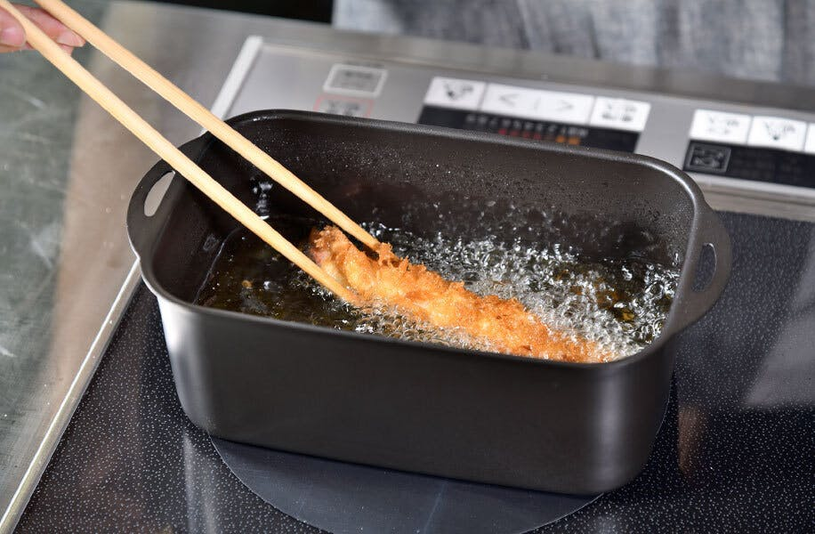 長方形という揚げ物鍋としては珍しい形は、アスパラやエビ、串刺しされた食材など 、「長さのある食べ物」を綺麗に揚げることができます。