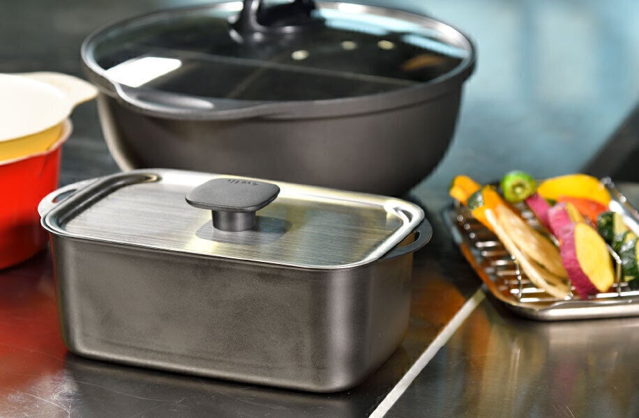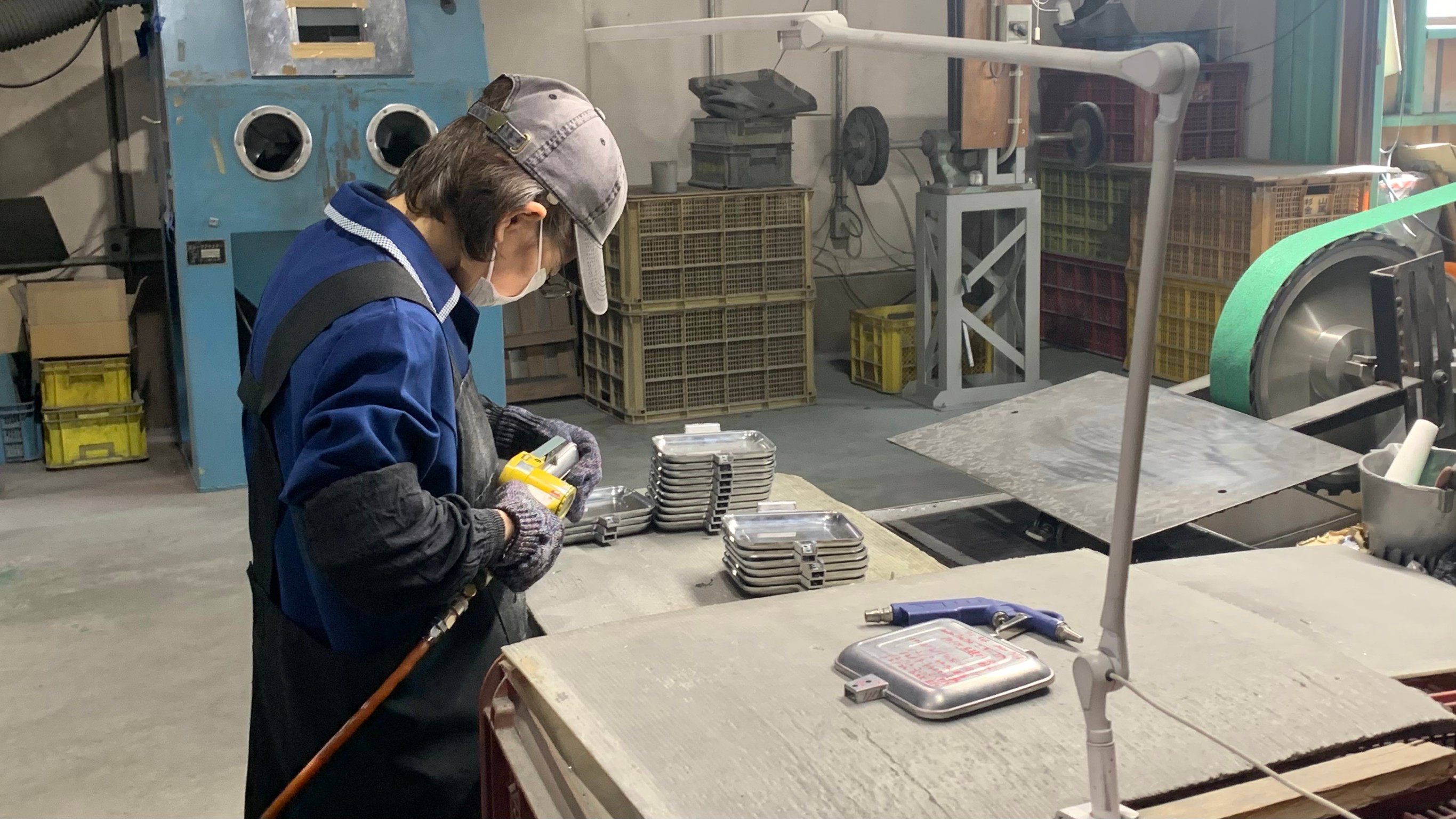 今まで長方形の鍋が少なかった理由を工場の方にお聞きしたところ、製造が難しく、製造効率も丸い方が作りやすいことから、丸い鍋が主流になっていると教えていただきました。