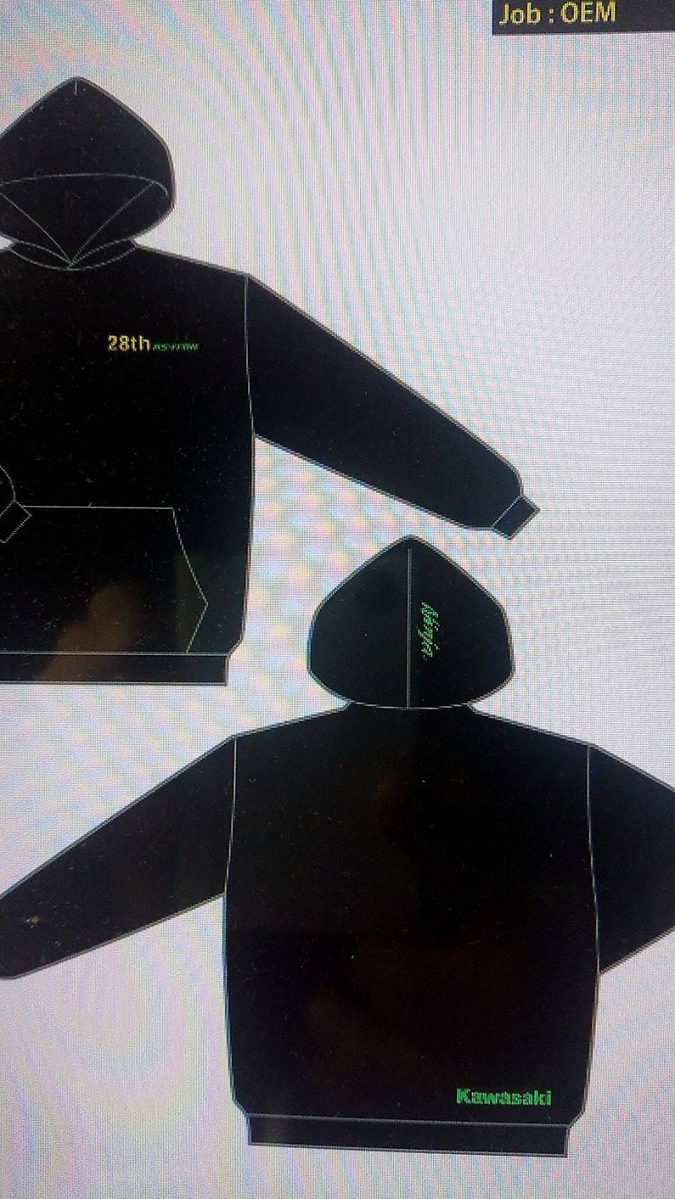 プロジェクトご支援のリターン RS-ITOHのオリジナルパーカーのデザインが出来上がりました。「28年目の挑戦!」という事で左胸に「28th」プリント。フードには「Ninja」後ろ裾に「Kawasaki」のプリントが入ります。