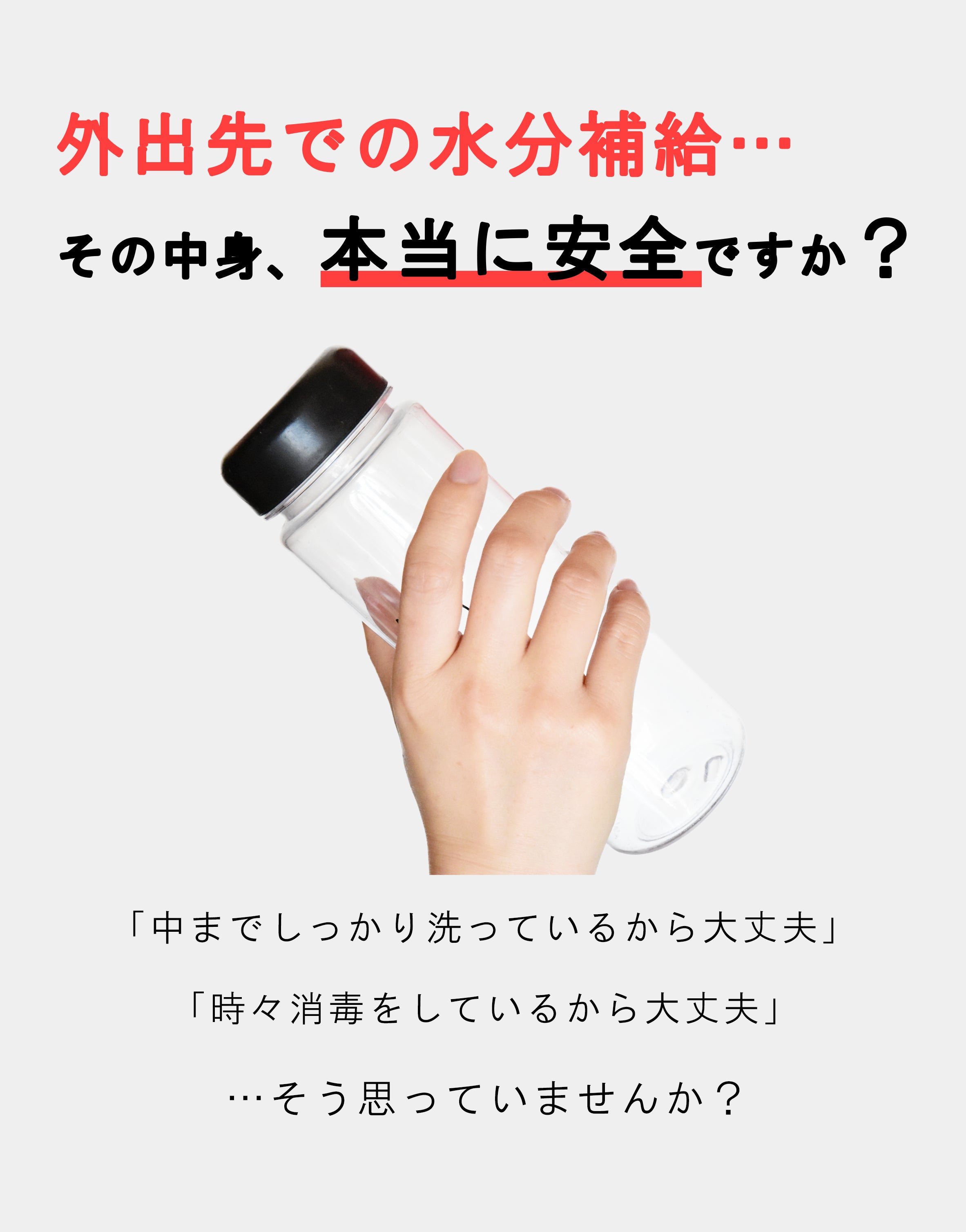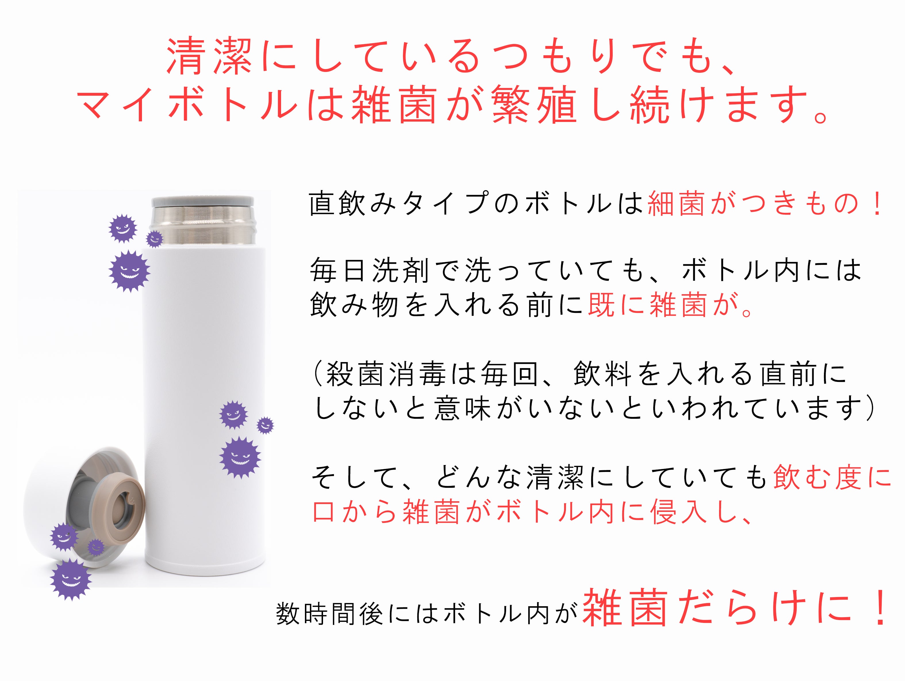 確かに通常のボトルであれば細菌は時間と共に繁殖します。しかし!ユーブボトルであれば99.9殺菌するUV-C紫外線を照射し液体もボトルも殺菌し、蓋がミラーの仕様になっているのでボトル内全域を照射します。