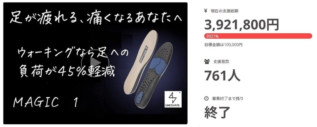 前回のプロジェクト「いつもの靴に"入れるだけ"で足の負担を最大70%軽減 インソール MAGIC 1(マジックワン)」では、支援目標の3921%、761人の支援者様に応援をしていただきました。