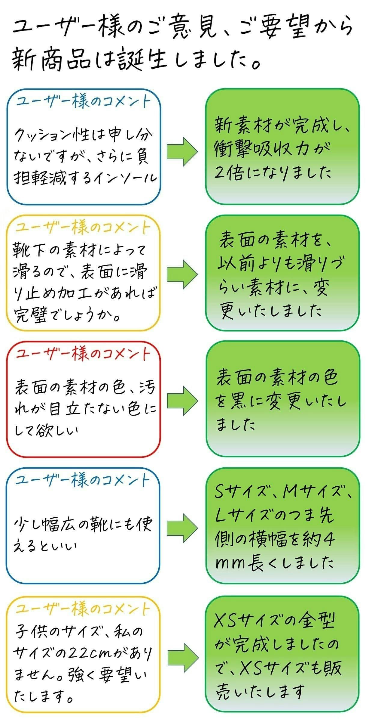 22cmのインソールがない、薄いインソールがない、もっと衝撃吸収力のあるインソールを開発してほしいなど、足・膝・腰のケアにお悩みの方から、たくさんのご要望をいただいております。