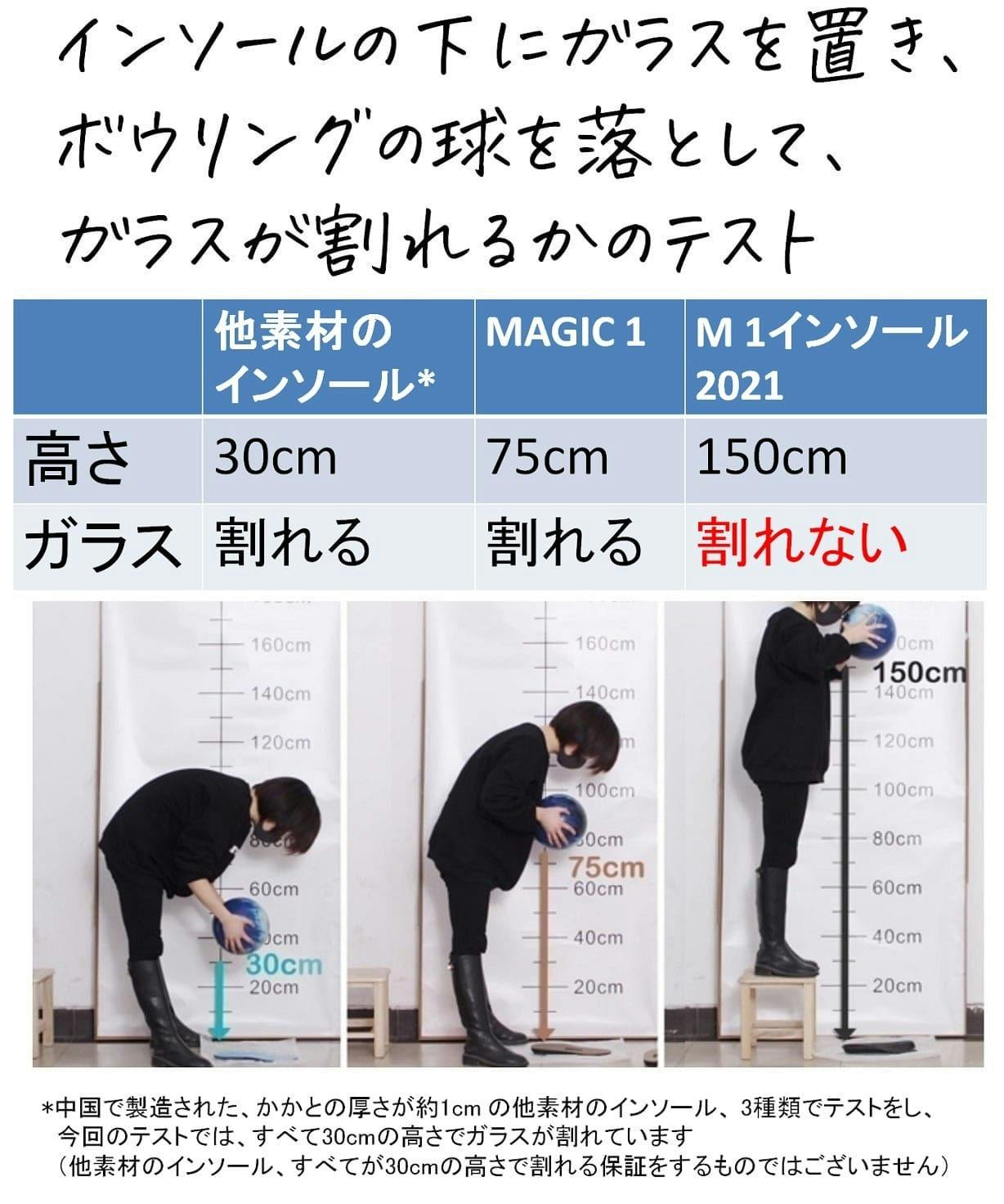 ガラスが割れた高さから、M1インソール 2021の衝撃吸収力は、MAGIC 1の2倍以上