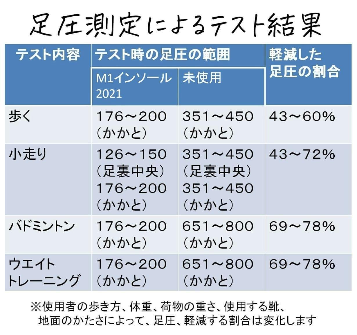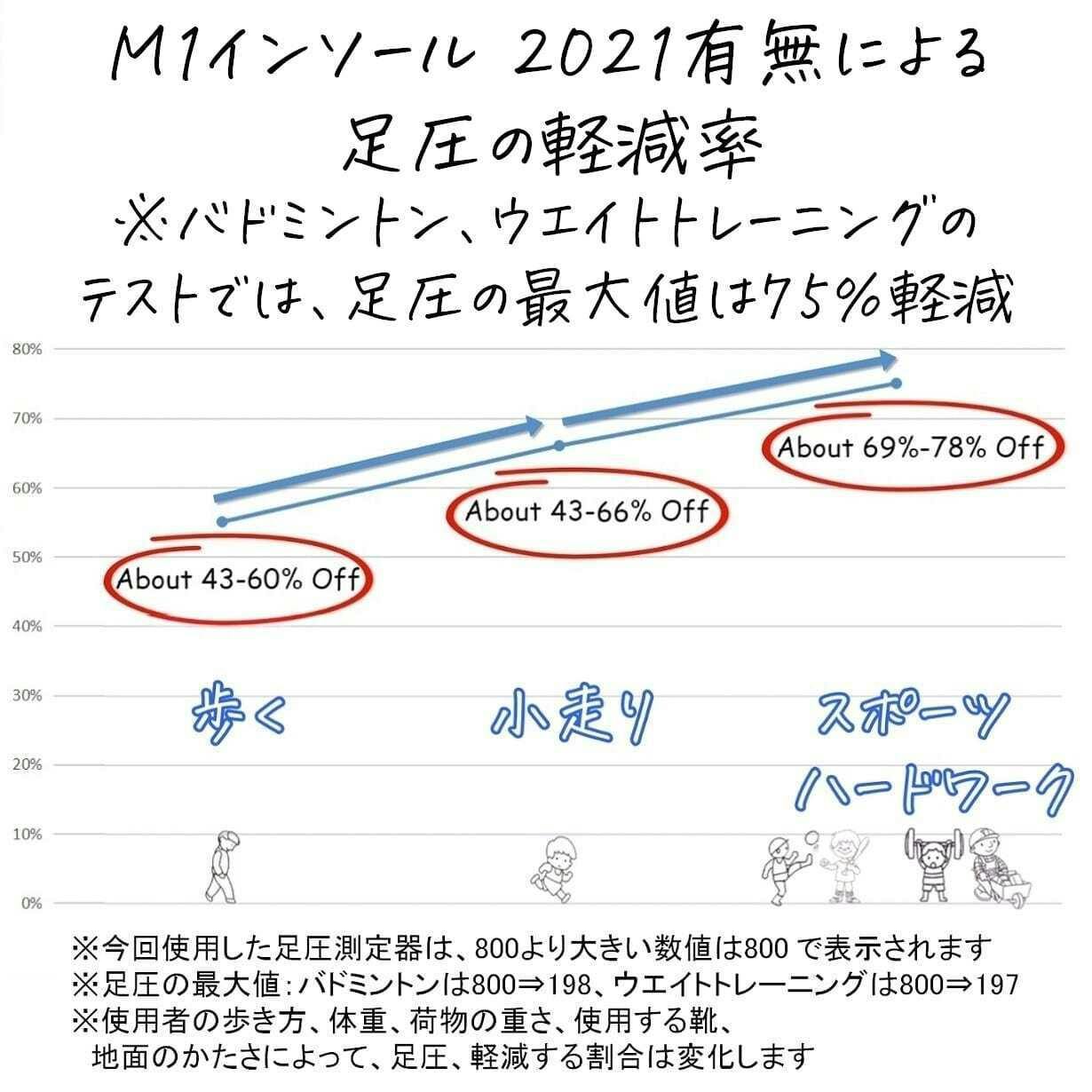 M1インソール 2021を使用することで、使用しないときと比べ、足圧の最大値が約43~78%軽減というテスト結果を得ました。