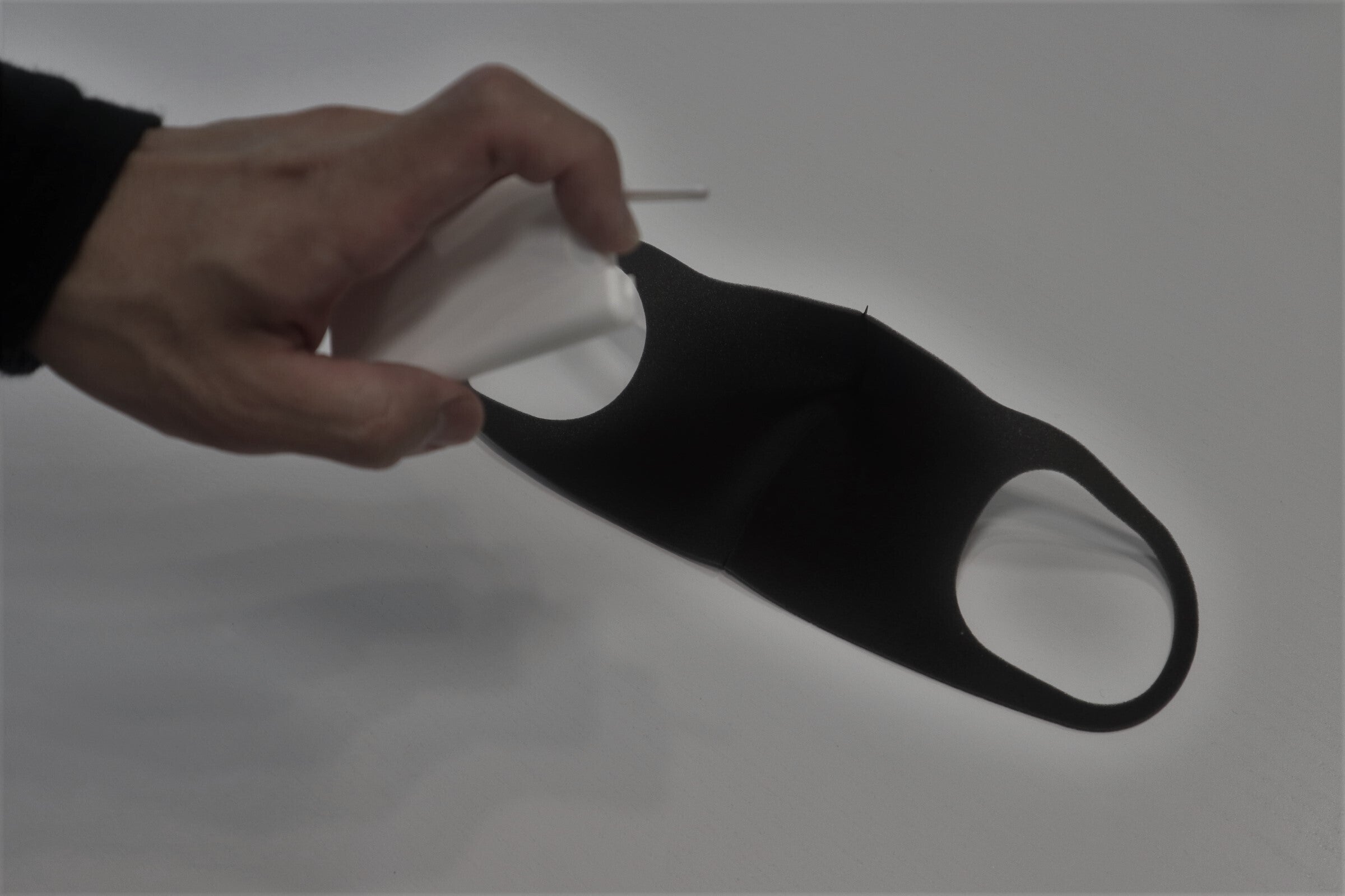 【マスキー】はマスクの両耳掛けヒモをミゾと凸部に引っ掛け、張力によってマスクを保管できます。