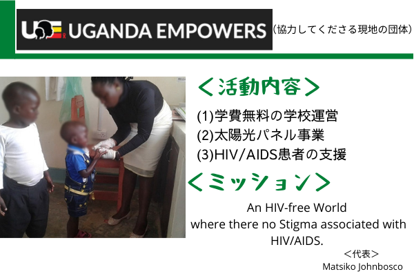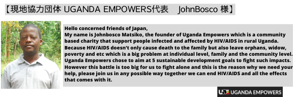 私の名前はジョンボスコ・マチコです。"UGANDA EMPOWERS"は、ウガンダの農村部でHIV/AIDSに感染した人々を支援するコミュニティベースの慈善団体です。