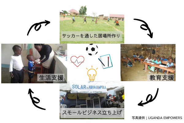 「サッカー」⇨「教育」⇨「スモールビジネス立ち上げ」⇨「生活支援」⇨「サッカー」⇨、、、