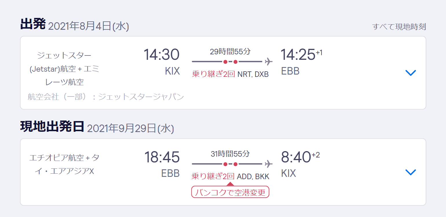 2021年 8月4日14:30 関西空港発 ー 5日 14:25 ウガンダのエンテベ空港着