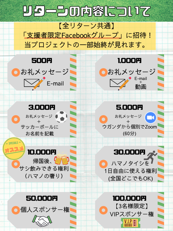 当初は、「オリジナルウガンダTシャツ/サッカーボール」などを作ろうとしていたのですが、