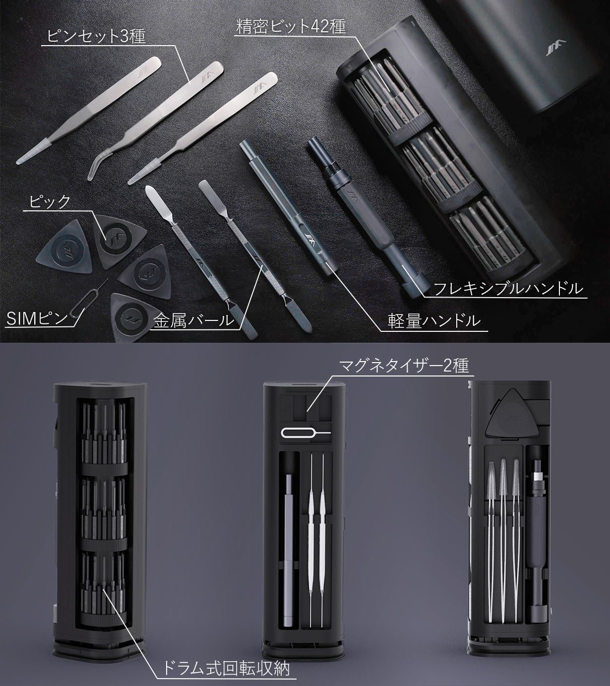 幅広いシーンに対応できる2種のハンドルと42種のビット、その他便利ツールがセットになったコンパクト精密ドライバーセット【JIMI Stand56】です!