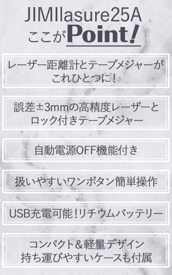 レーザー距離計とテープメジャーがこれひとつに!USB充電式&専用ケース付きで持ち運びもラクラクな手のひらサイズの万能距離計【JIMIlasure25A】です!