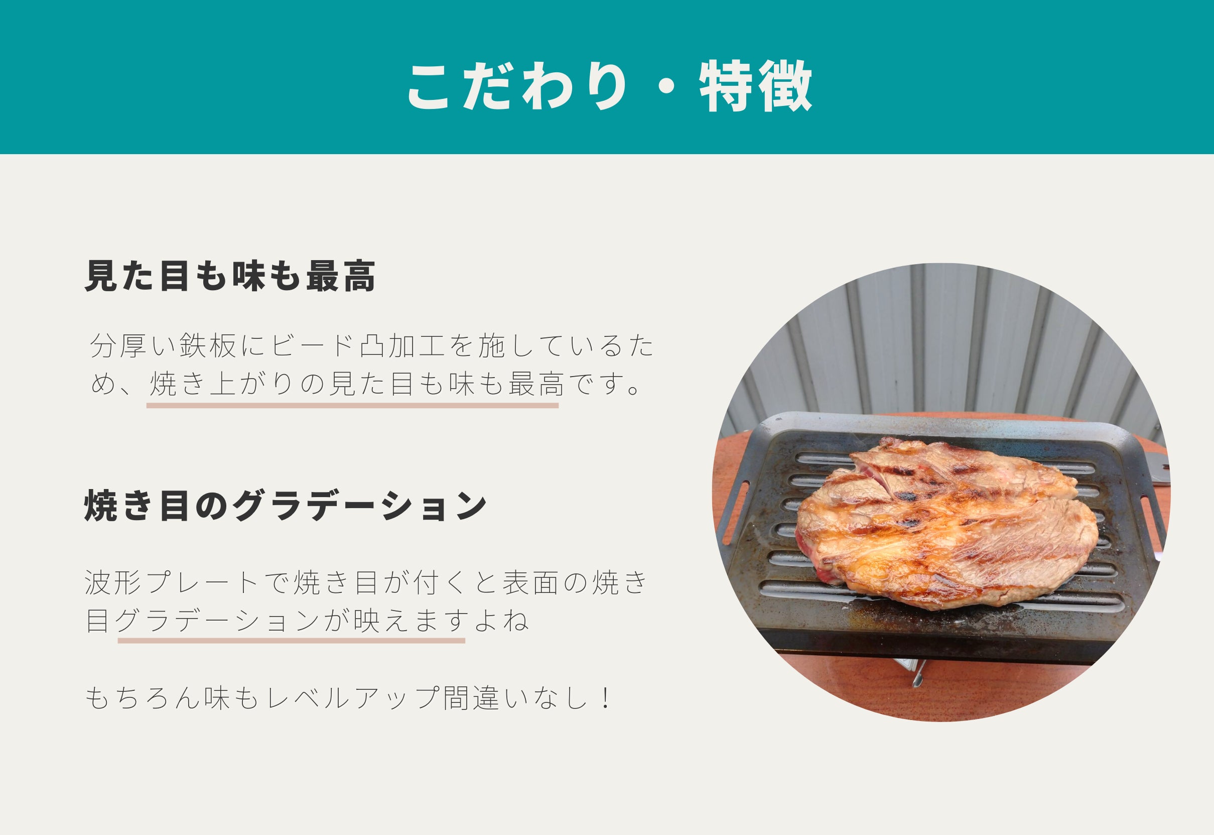 ・分厚い鉄板にビード凸加工を施しているため、焼き上がりの見た目も味も最高です。