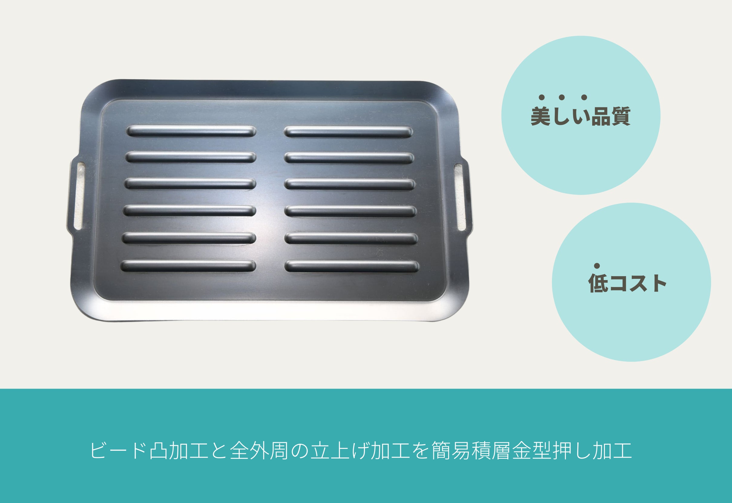 ・ビード凸加工と全外周の立上げ加工を簡易積層金型押し加工で加工している為、美しい品質、低コストで製作可能。