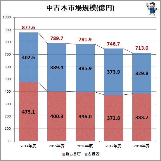 ブックオフさんや、古本市場さんように比較的新しいリサイクル本を販売されているのが「新古書店」(図:赤帯)我々のように、絶版本や歴史書物、骨董アイテムなどを扱うのが「古書店」(青帯)です。古書には古書の魅力があり、伝統的な業種ですが年々市場規模は衰退傾向にあります。