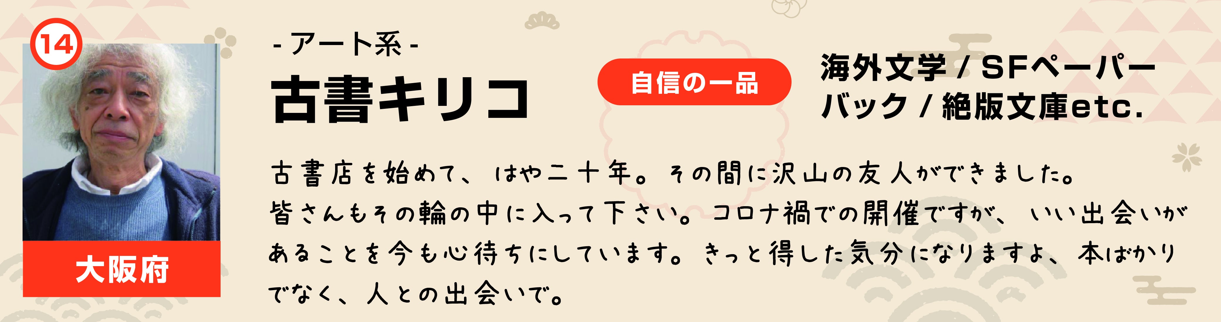 ⑭古書キリコ 大阪府箕面市瀬川4-15-53 TEL072-724-5877