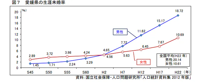 そのことから今回、愛媛県の未婚化を調べてみると、未婚率がどんどん上昇している現実を知りました。