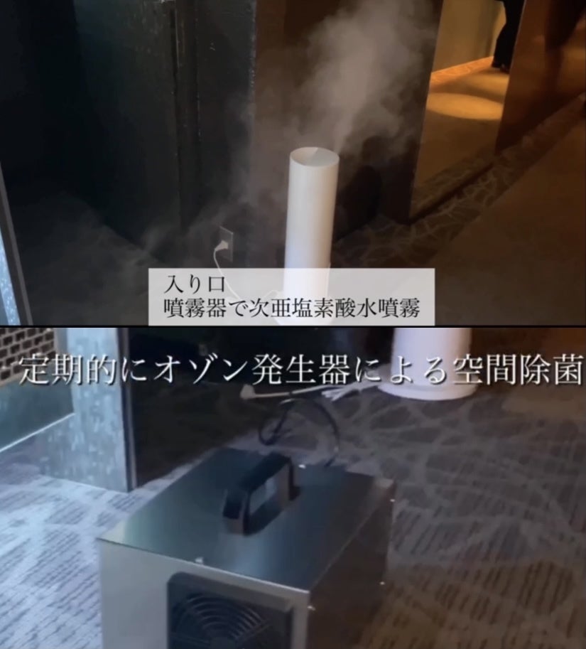 入り口やホールでの次亜塩素水噴霧や営業中や営業後にオゾン発生機で全体の除菌を行なっております。